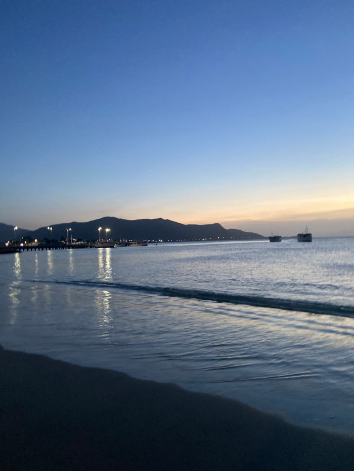 A landscape shot of a beach at dusk. Mountains rise in the distance, their dark silhouettes contrasting with the fading sunlight on the horizon. Bright lights line the shore. Gentle waves lap the sand…read more