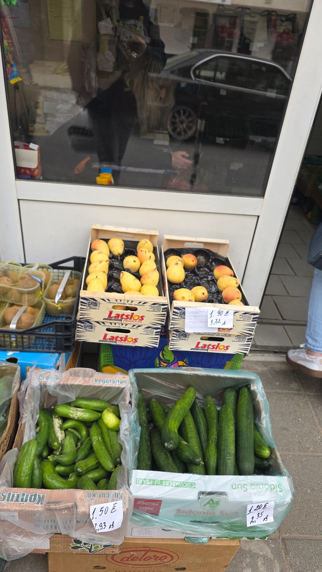 The image captures an outdoor street-level scene in Blagoevgrad, Bulgaria, featuring a display of fresh produce in front of a shop. The main subjects are various fruits and vegetables arranged in wood…read more