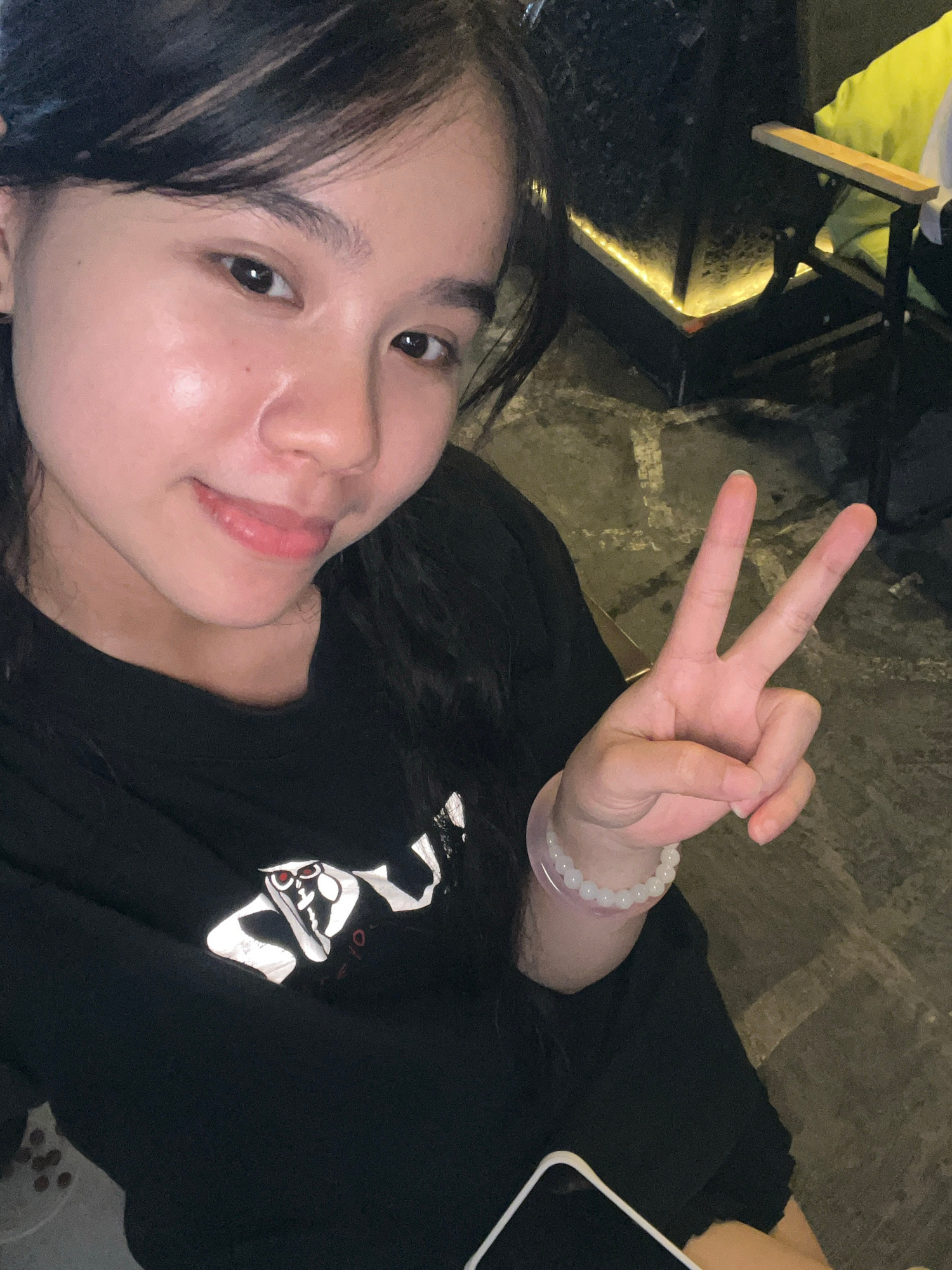 A person with dark hair and fair skin is positioned in the lower-left quadrant of the frame, angled upwards towards the camera. They are giving a "peace" or "victory" sign with their right hand. The h…read more