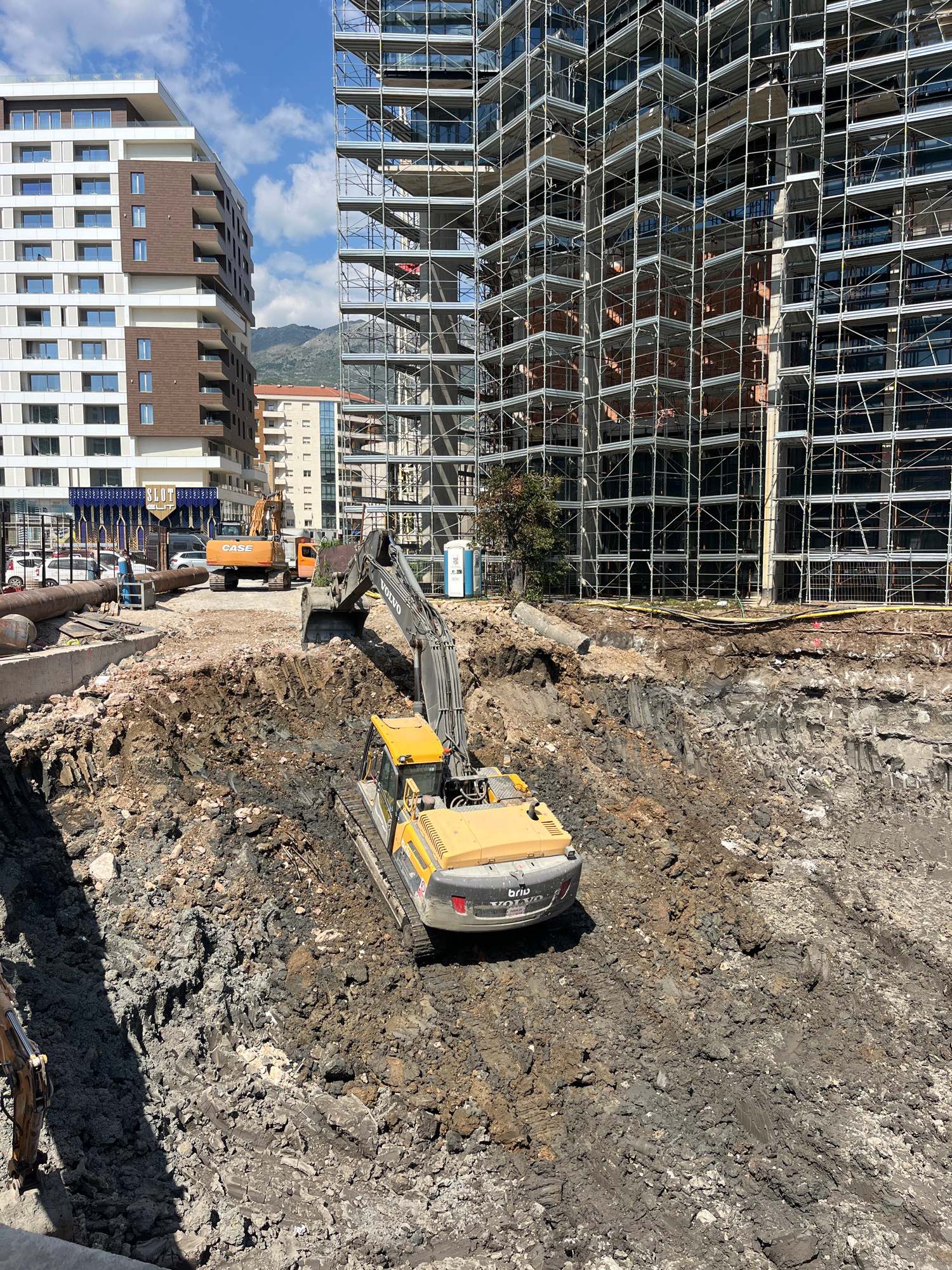 The image shows a construction site in Budva, Montenegro. A tall building with scaffolding occupies the left side of the frame. An excavator is digging in the foreground, surrounded by excavated earth…read more