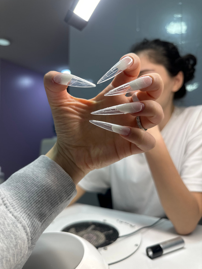 This close-up, low-angle shot, taken in Yerevan, Armenia, features a person's hand adorned with exceptionally long, clear, pointed artificial nail tips, indicative of a nail enhancement procedure in p…read more
