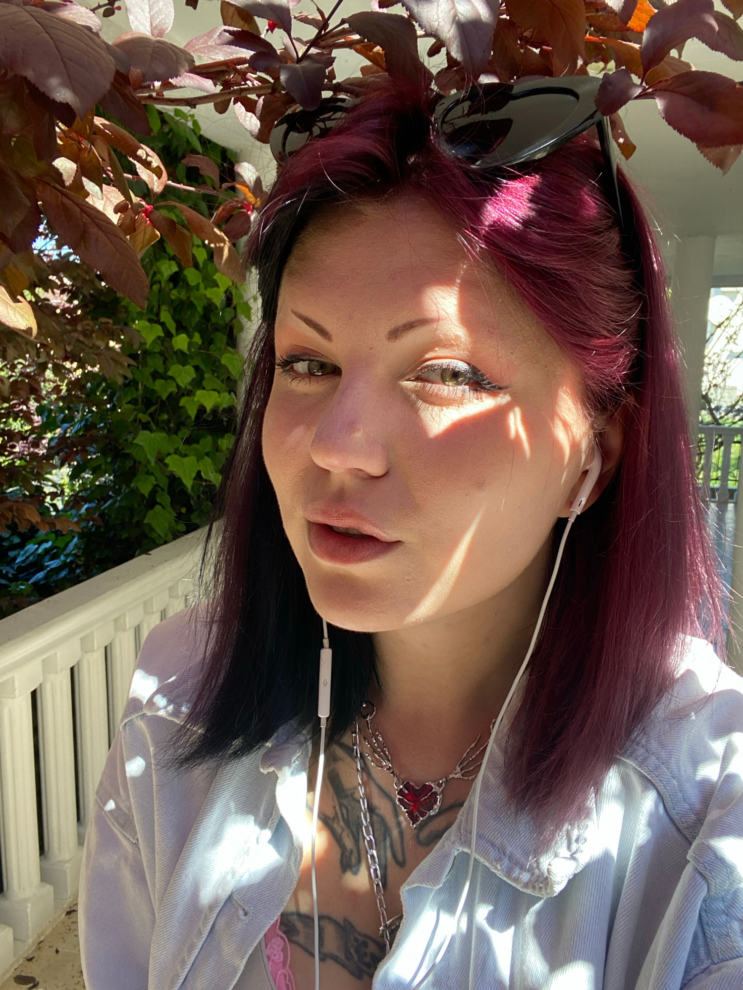 A young woman with dyed burgundy hair is the focal point of the image. Her hair transitions to black at the roots. She is wearing white earphones and has sunglasses perched atop her head. She also has…read more