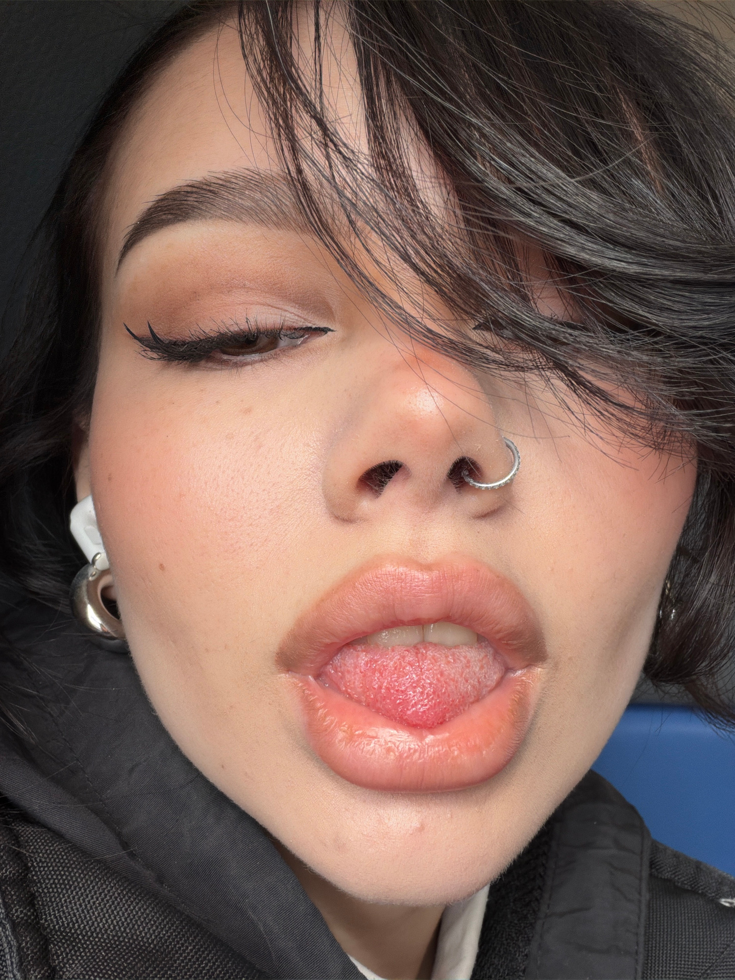 A close-up shot features a young person lying down, possibly in an urban environment. Their face is the primary focus, displaying a closed eye with defined eyelashes, a nose ring, and an open mouth wi…read more