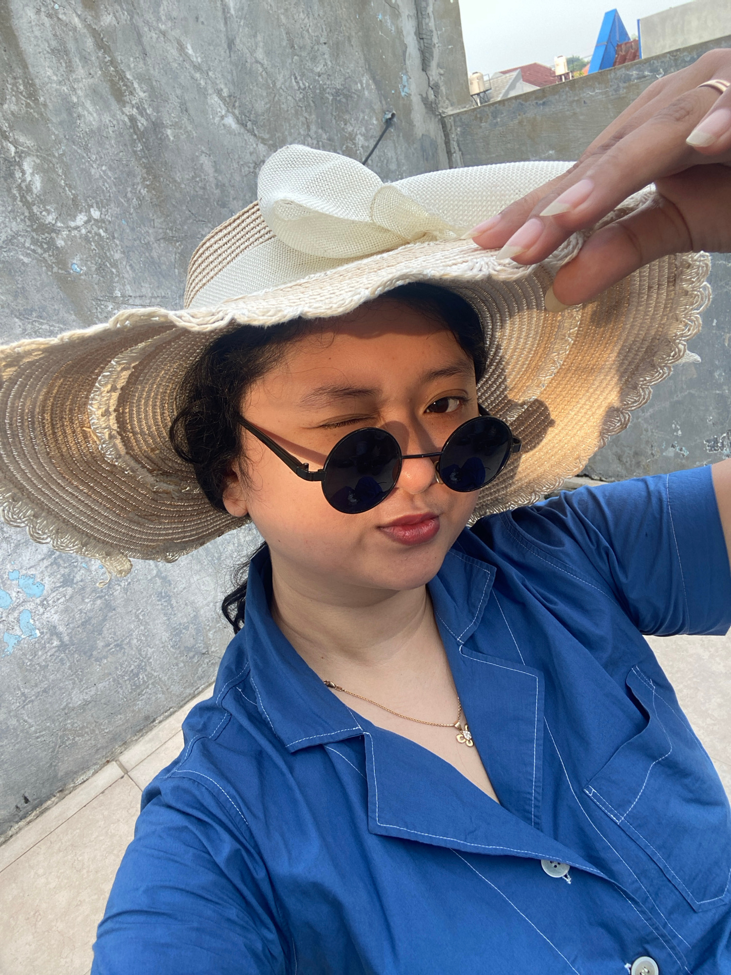 A woman wearing a blue button-down shirt, sunglasses, and a straw hat poses for a selfie outdoors in Gelam, Indonesia. Her hand, with long manicured nails and a ring on her finger, holds the hat. She…read more