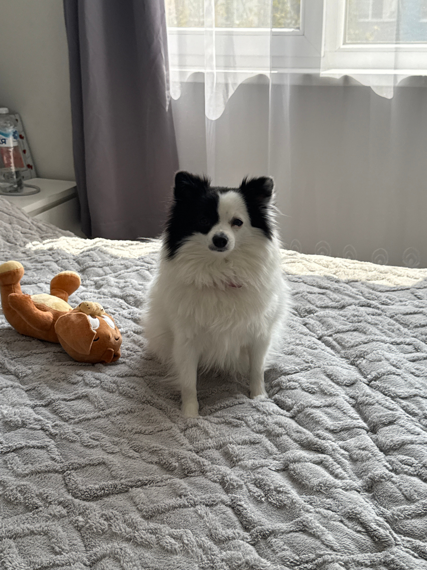 A medium shot captures a black and white dog lying on a gray patterned blanket. A brown stuffed teddy bear lies near the dog's legs. In the background, a window is visible. The location cannot be deteβ¦read more
