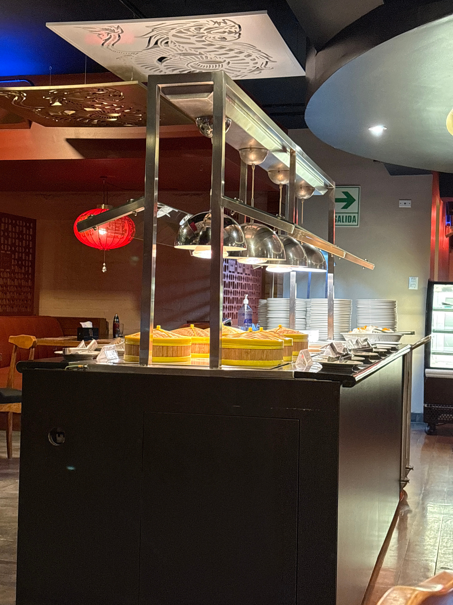 The image shows an indoor scene in what appears to be a restaurant or dining area. The foreground is dominated by a large, dark cabinet or counter. To the left, a metallic structure supports what seem…read more