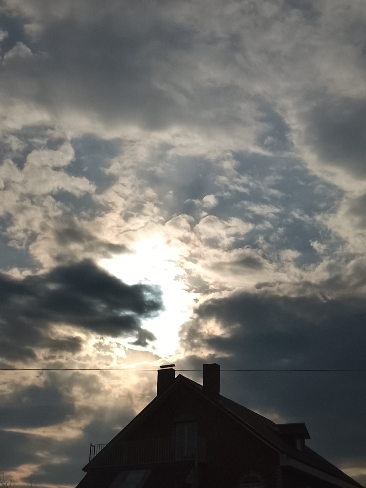 The photograph depicts a silhouette of a building against a dramatic sky. The sky is filled with a mix of light and dark clouds, with the sun attempting to break through, creating rays of light. The b…read more
