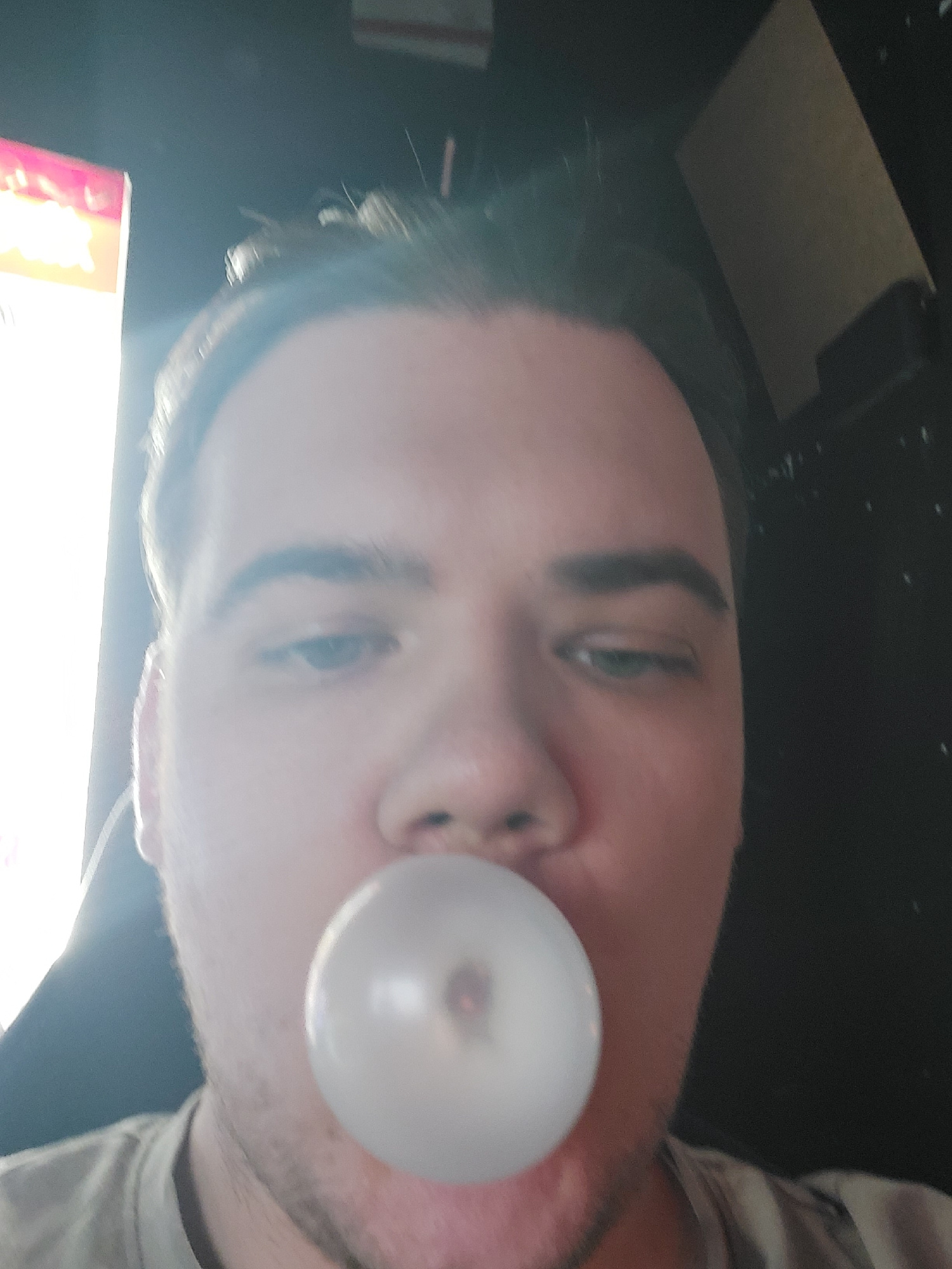 A person is inflating a bubblegum. The photograph appears to be taken indoors. There is a black surface visible below the person, possibly a table. There are no indications of the location being in Ta…read more