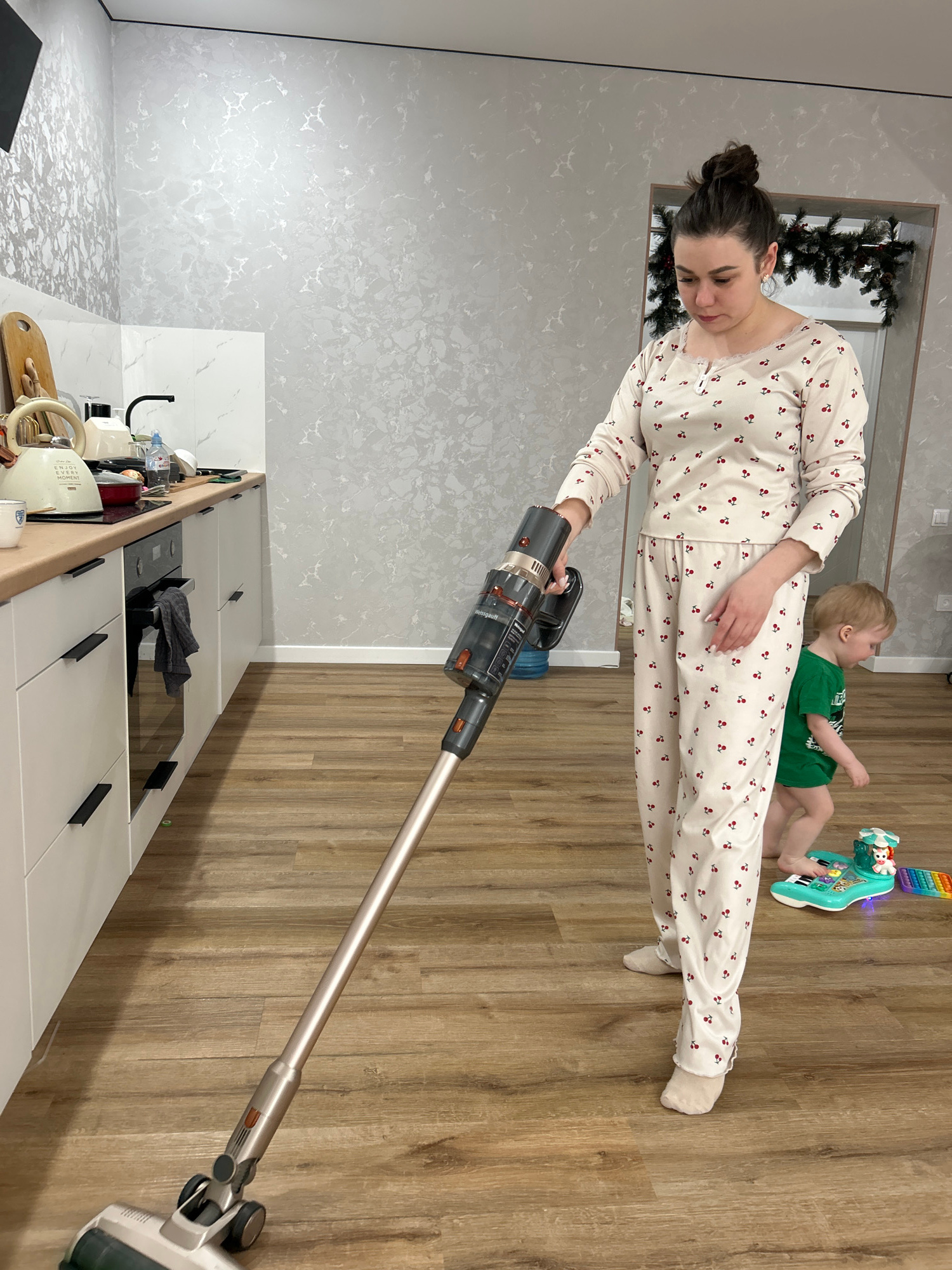 This image, taken in Chaikovsky, Russia, captures an indoor scene featuring a woman and a young child. The woman, with dark hair tied in a bun, is wearing light-colored pajamas adorned with a red cher…read more