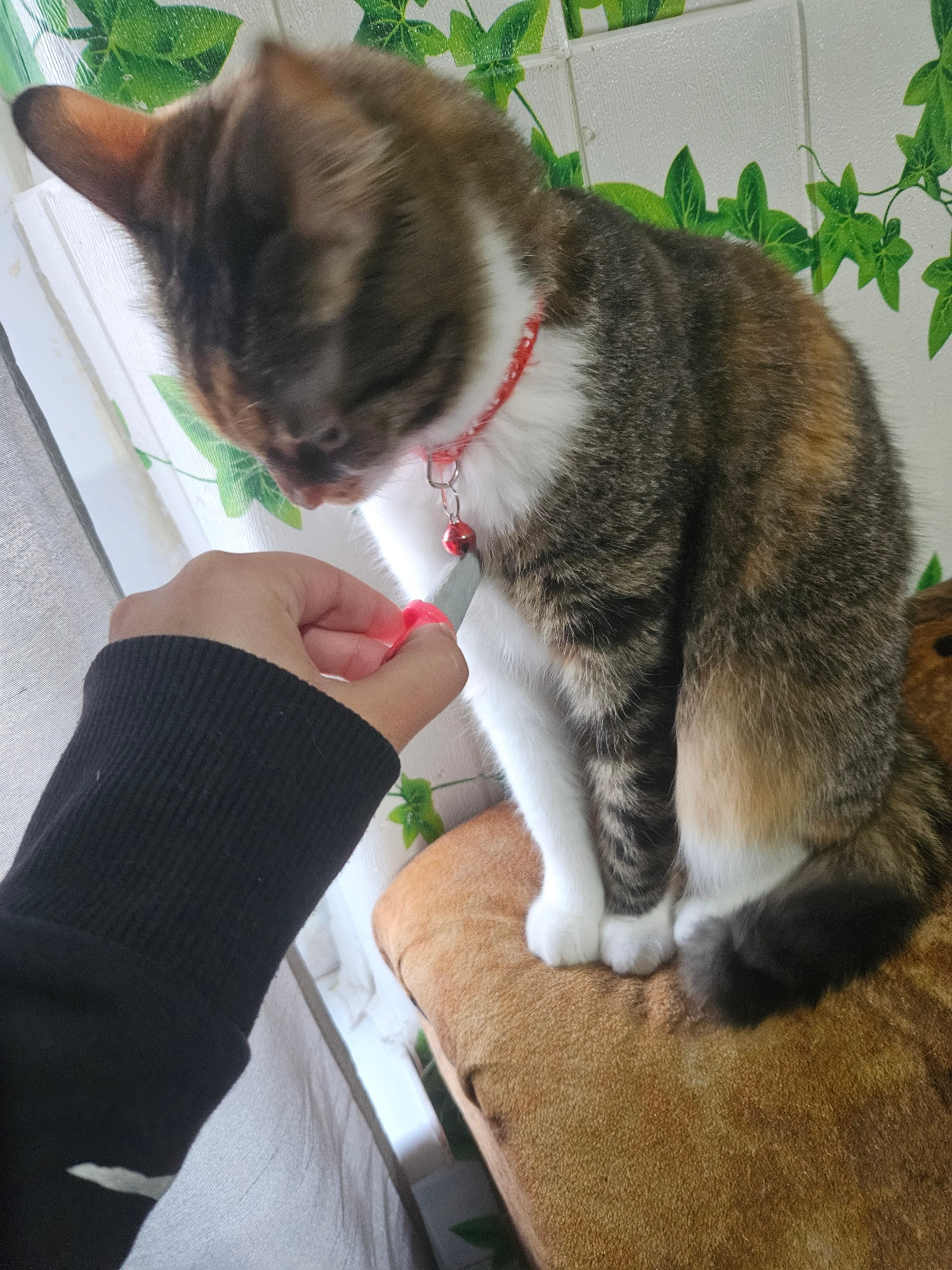 The image shows an indoor scene featuring a domestic cat and a human hand interacting, set in Yambol, Bulgaria. The primary subject is a calico-patterned cat, displaying a mix of brown, grey, white,…read more