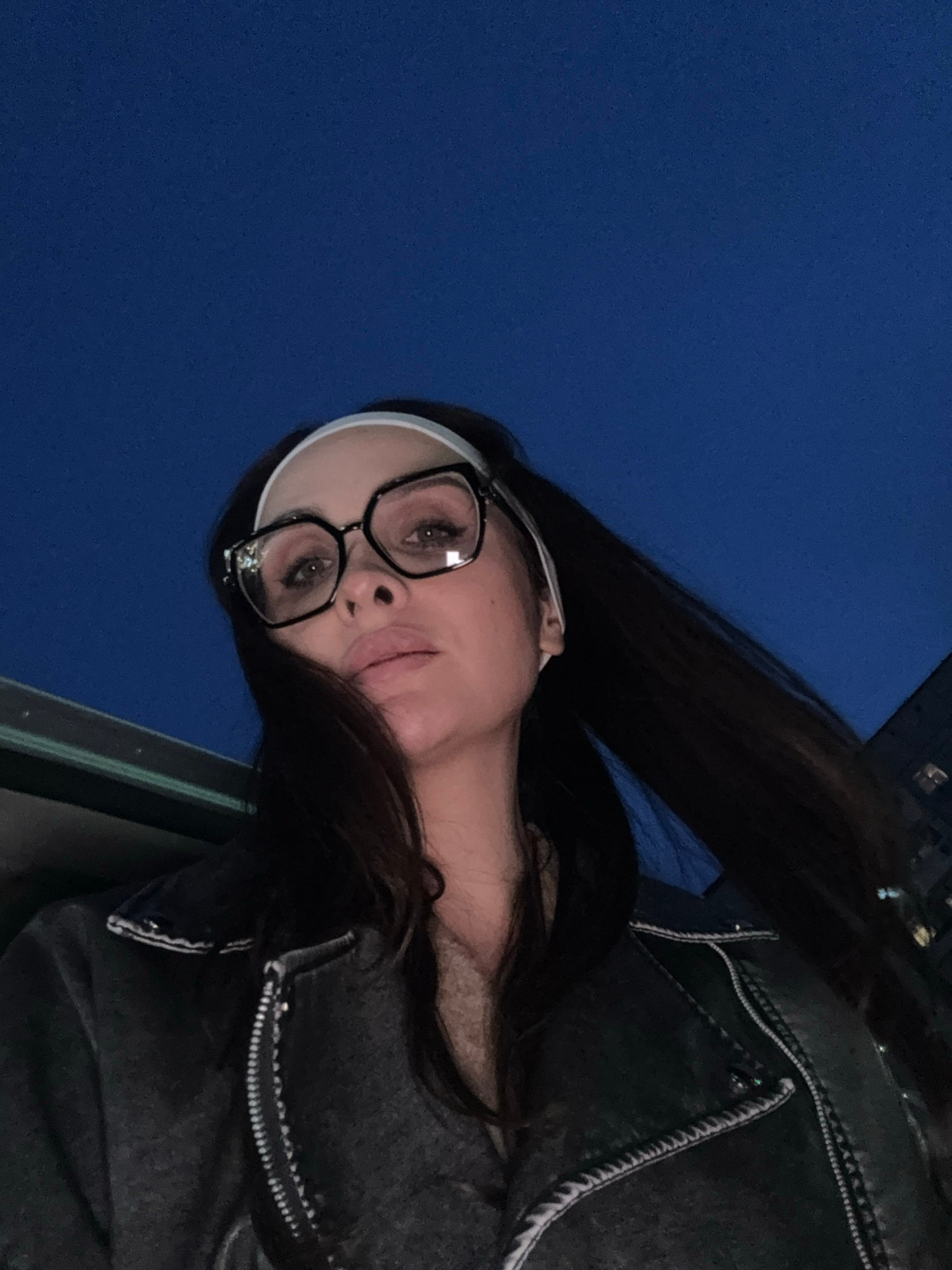 The image shows a woman wearing glasses, a white headband, and a dark jacket. The background is a dark blue sky. The location is likely outdoors at night, potentially in a city. There is no informatio…read more