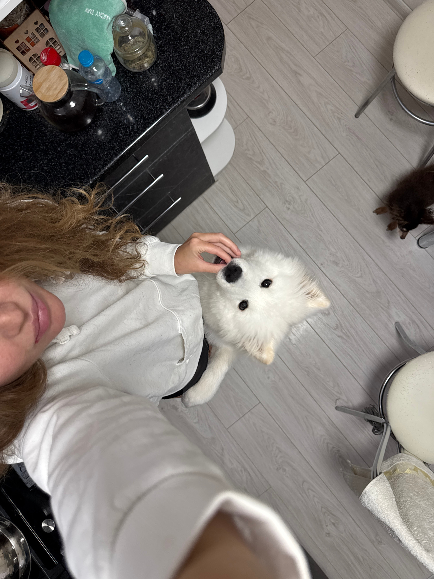 A high-angle shot in an indoor setting, possibly a kitchen, shows a fair-skinned person with curly brown hair partially visible at the bottom of the frame. The person is wearing a white sweater and ap…read more