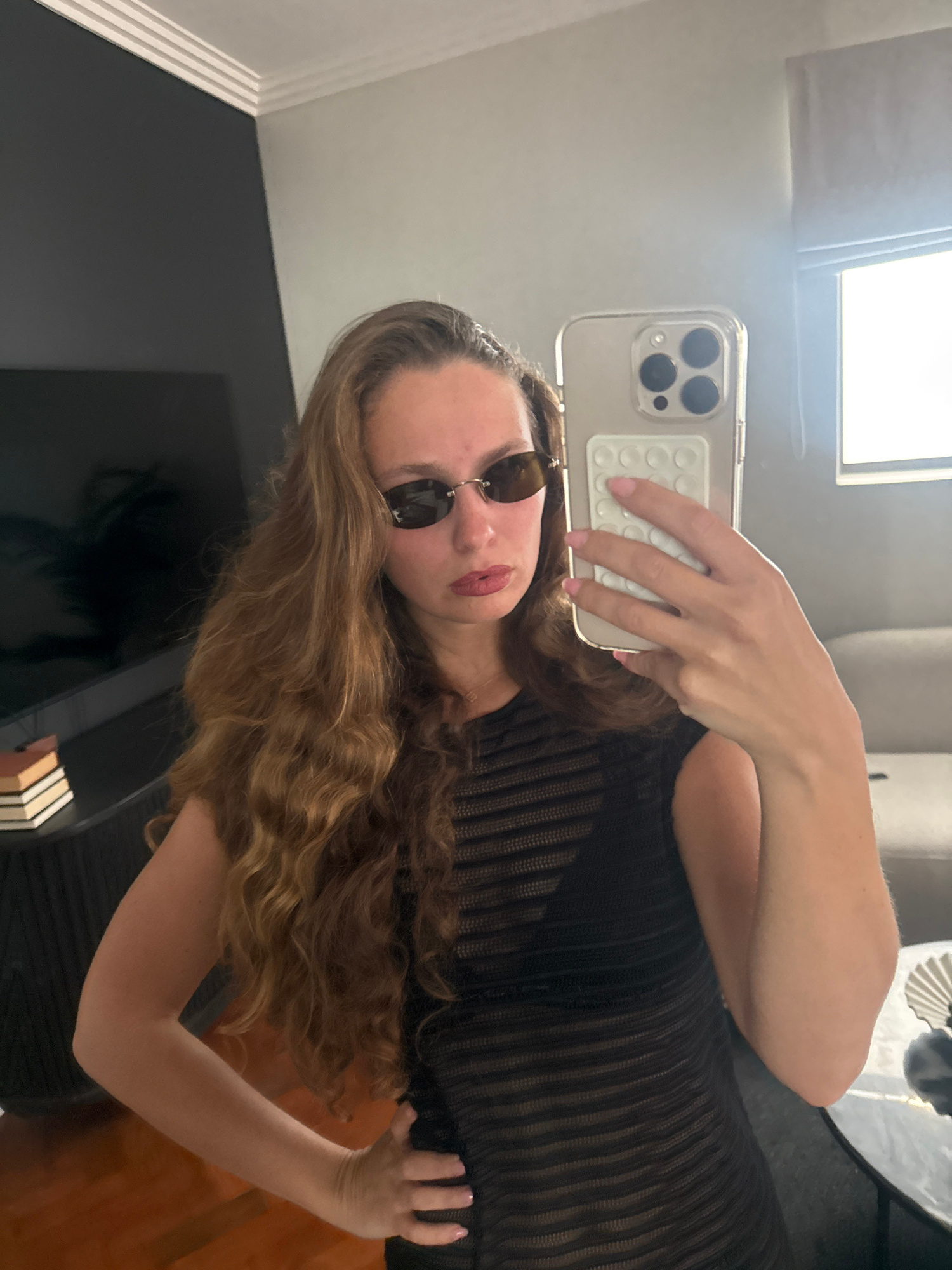 A young woman with long, wavy brown hair takes a selfie with her iPhone in an indoor location. She wears sunglasses and a black, horizontally striped garment. The environment includes a window, wall,…read more