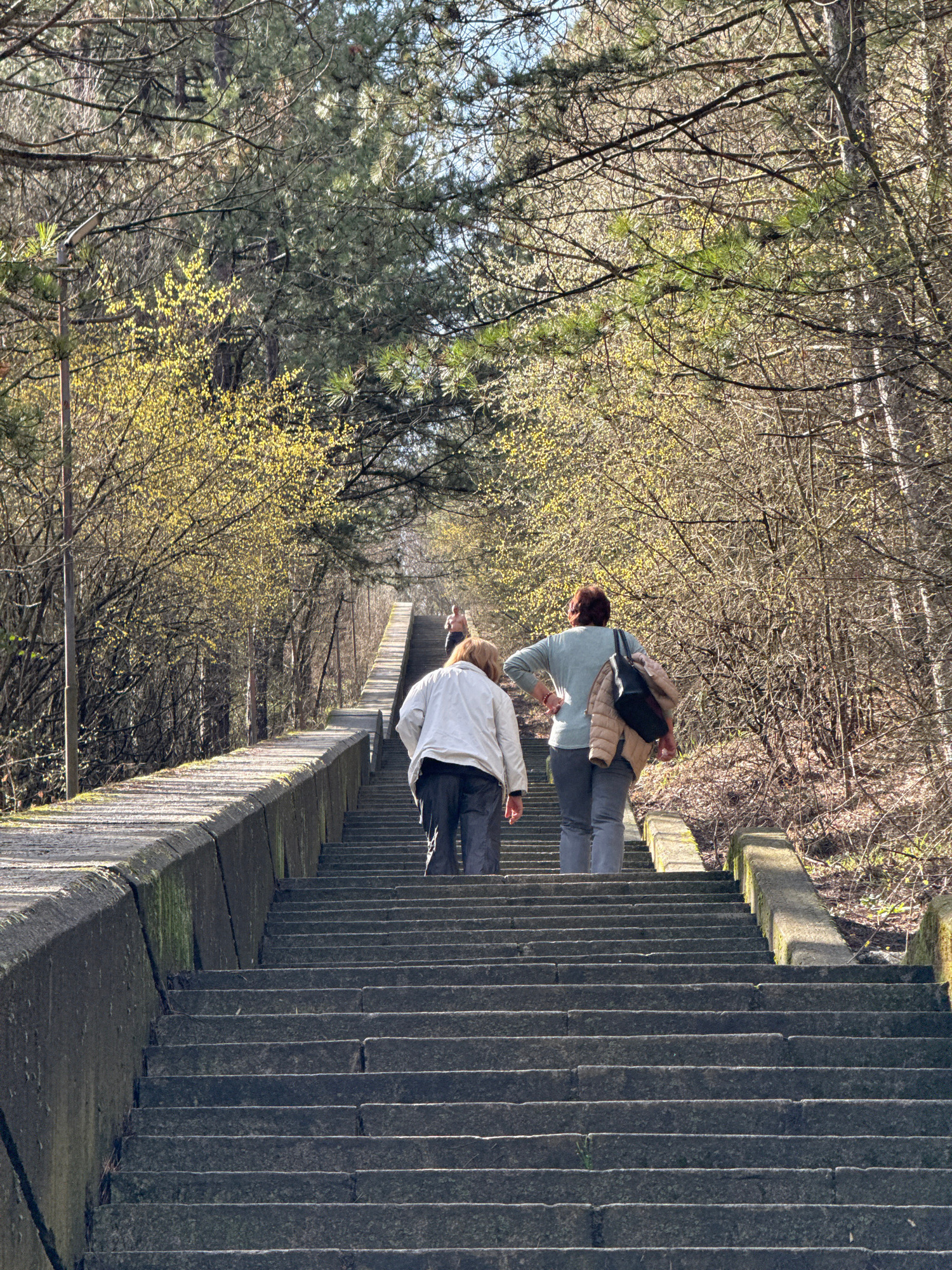 Two women are descending a long, concrete stairway that extends into a wooded area. The steps are gray and appear worn. Trees are visible on the left, some with budding yellow flowers. The sky is part…read more