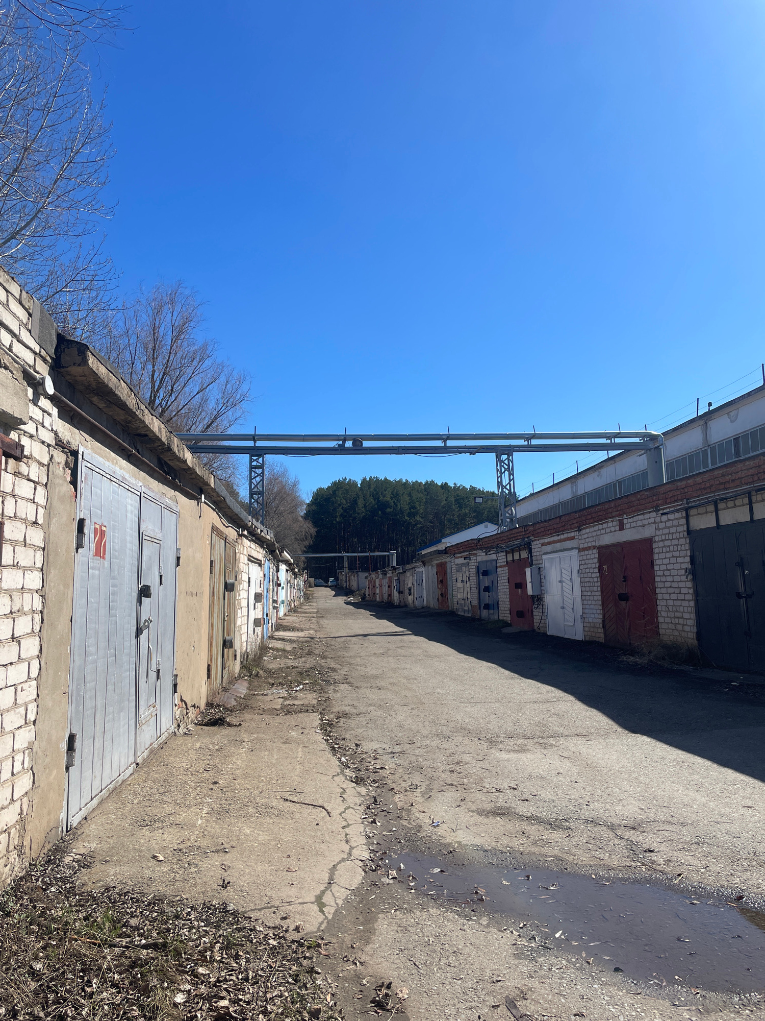 The image shows a row of garage doors along a cracked concrete alleyway in Chaikovsky, Russia. The garages are constructed of brick, with metal doors of varying colors and conditions. Some have visibl…read more