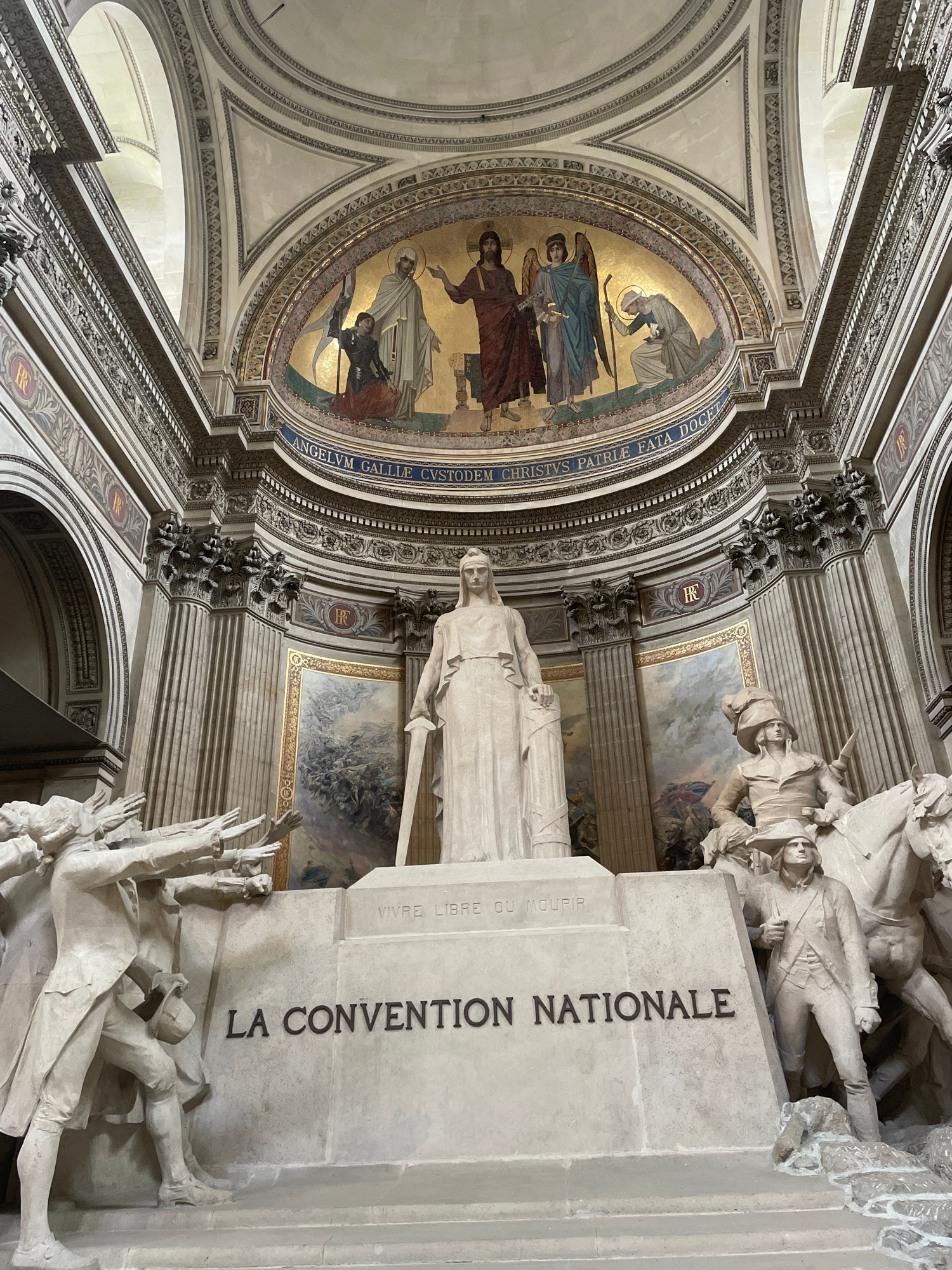 This photograph depicts an interior view of a building, capturing a statue of "La Convention Nationale" at the Panthéon in Paris, France. The statue is made of white stone and is inscribed with the wo…read more