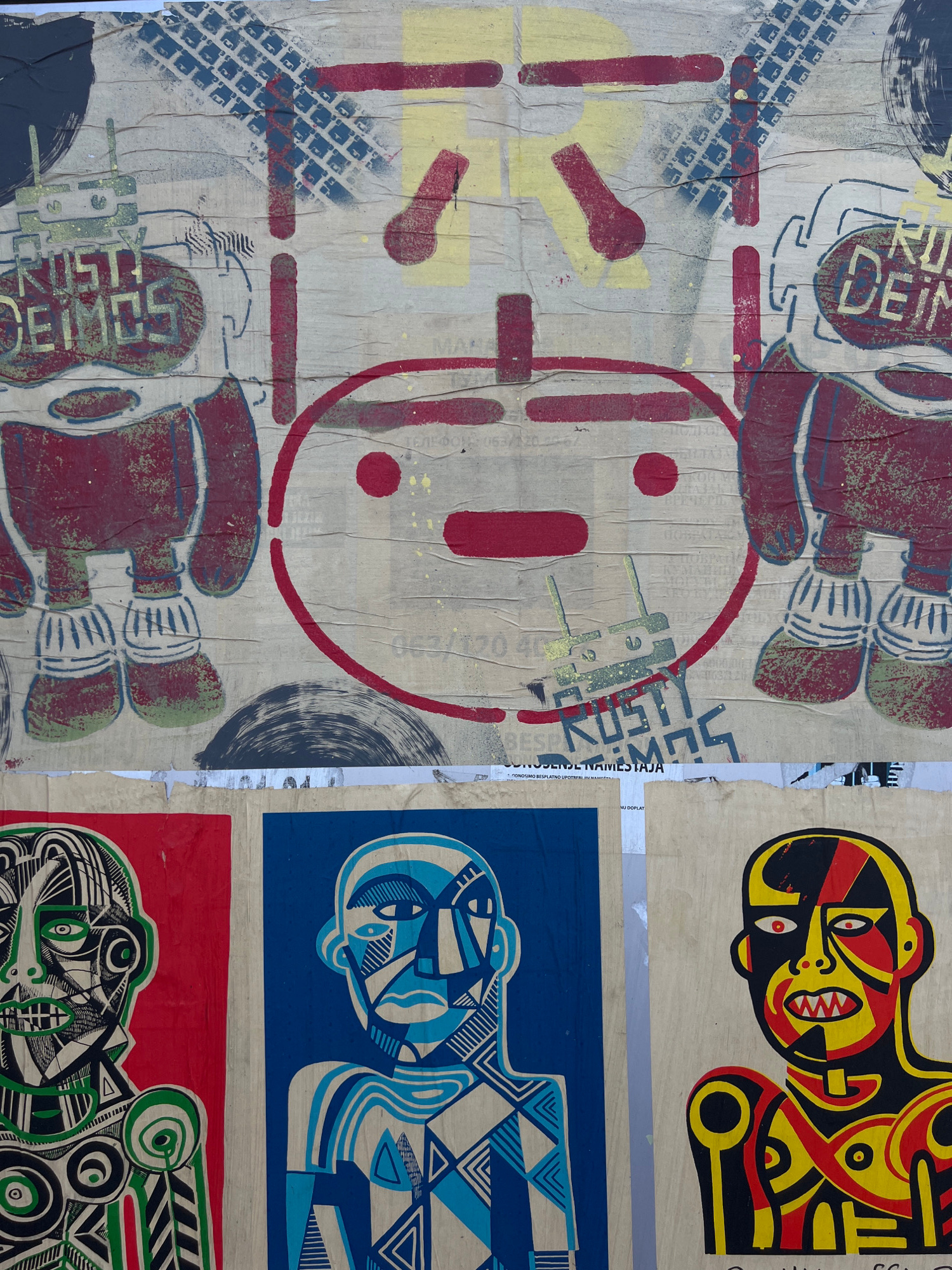 The image shows a collage of posters and stencils, likely found in an urban environment in Palilula Urban Municipality, Serbia. The leftmost portion features a faded beige poster with stenciled imager…read more