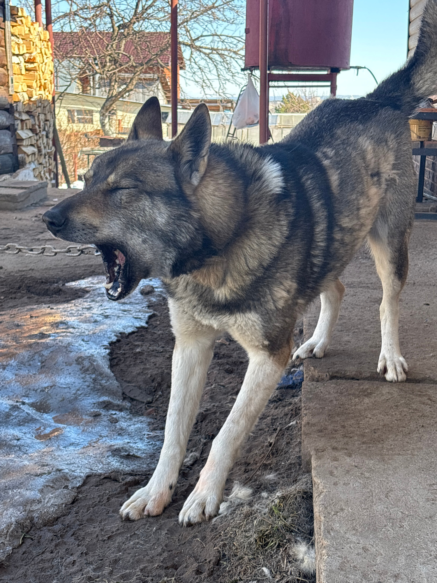 A medium-sized dog with a grey and tan brindle coat and white legs is chained in an outdoor area. The dog appears to be yawning. The ground is a mixture of dirt and standing water. A stack of wood and a building are visible in the background, suggesting an urban location. This image was taken in the city of Chaikovsky, Russia. | Open Wire