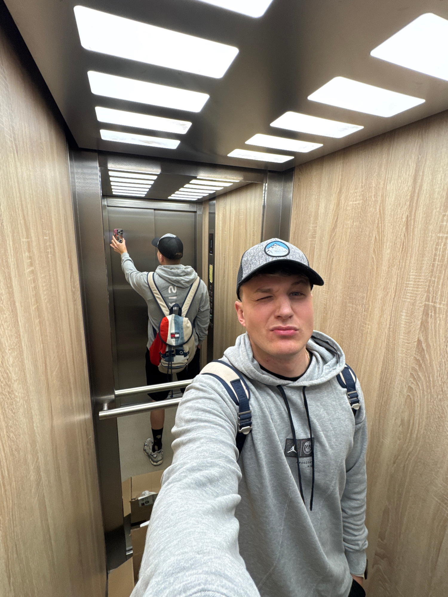 The image captures a young man taking a selfie inside a modern elevator, situated in Plovdiv, Bulgaria. He is looking directly at the camera with a playful wink or squint and a slight smirk. He wears…read more