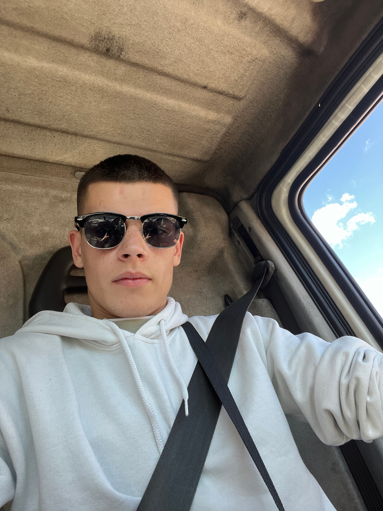 A young man wearing sunglasses and a white hoodie is seated in a car. He is wearing a seatbelt. The car has a sunroof, through which the sky is visible. The interior of the car is beige. No location i…read more