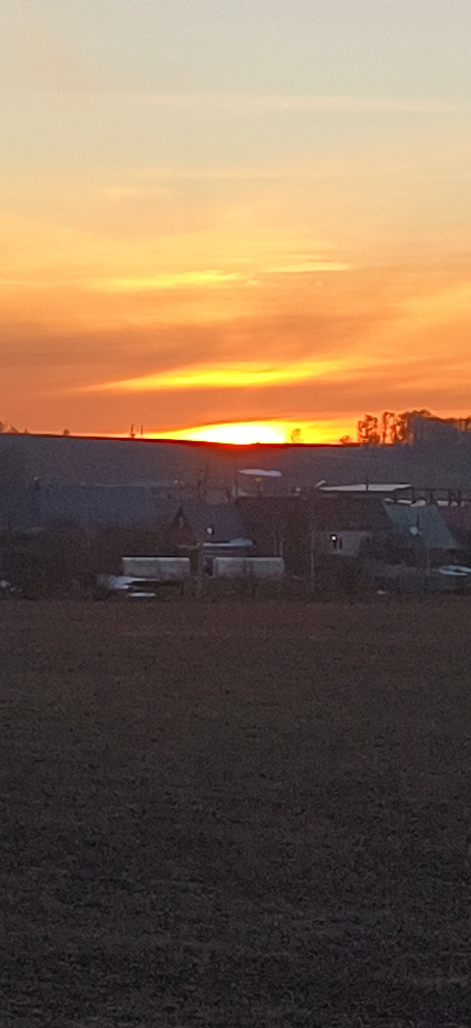 The image shows a rural landscape at sunset, likely in or near Фоки, Russia, based on the user's indication. The sky transitions from a bright orange near the horizon to a lighter yellow and pale blue higher up. The sun is setting behind a distant horizon line, creating a silhouette effect. Below the horizon are several buildings, including what appears to be farm structures and houses. A field in the foreground is dark and appears to be recently plowed or cultivated. No people are visible in the scene. The overall environment suggests a quiet, agricultural setting. | Open Wire