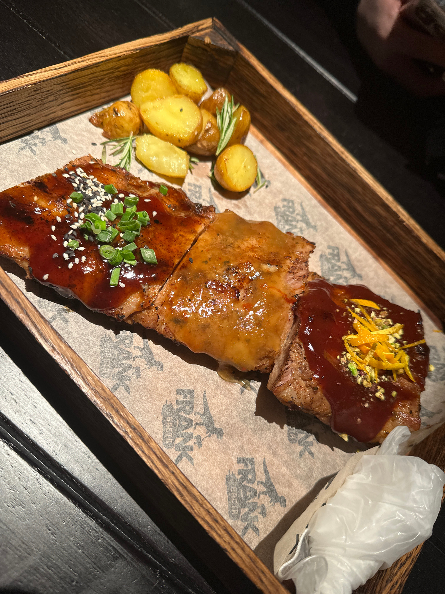 The image shows a wooden tray with three pieces of pork ribs covered in different sauces and toppings: one with a brown glaze topped with green onions and sesame seeds, one with a mustard-like sauce,…read more