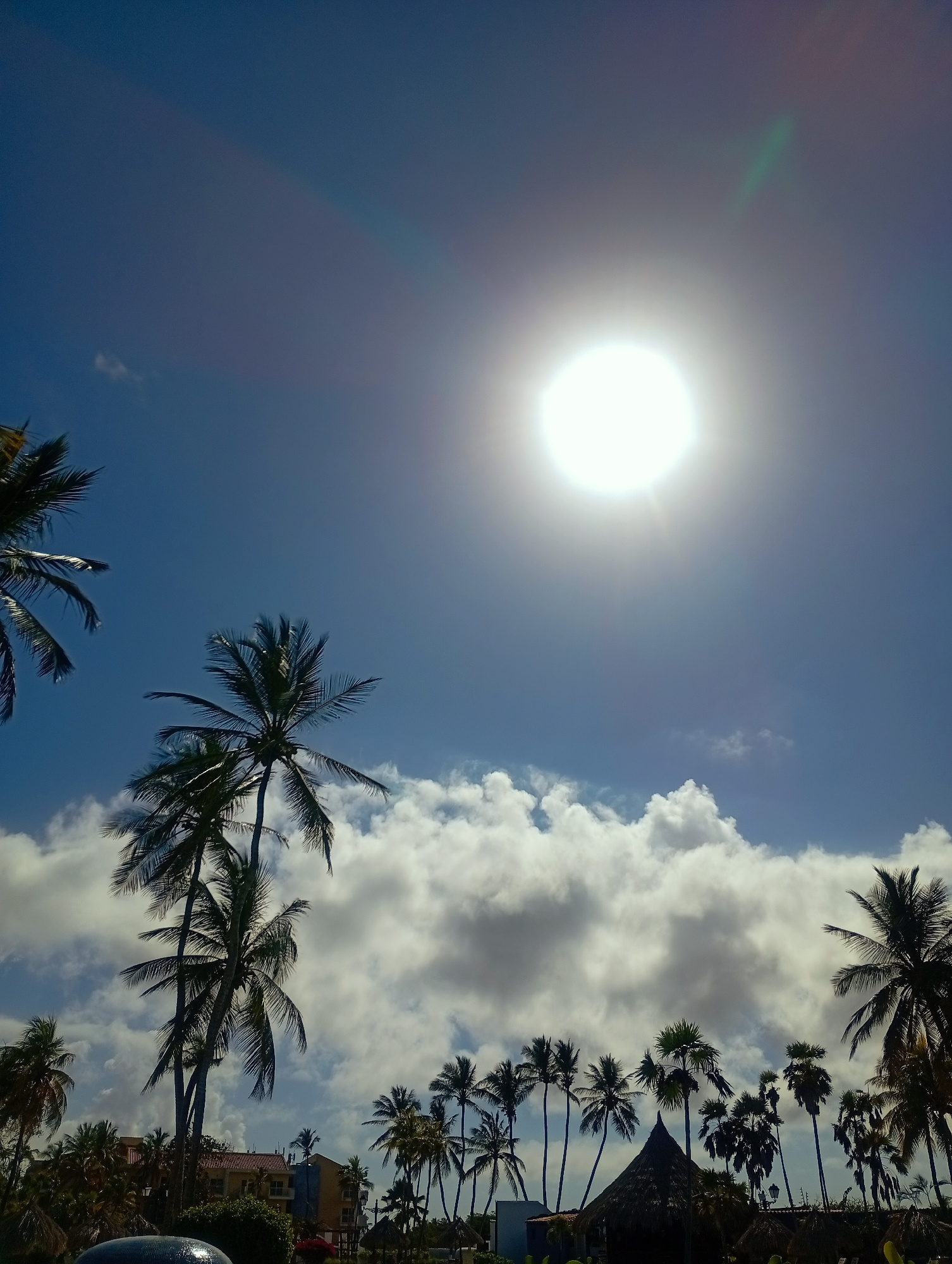 The image depicts a bright, sunlit tropical scene in Playa El Agua, Venezuela. The upper two-thirds of the frame is dominated by a clear blue sky with a prominent, bright circular sun located in the u…read more