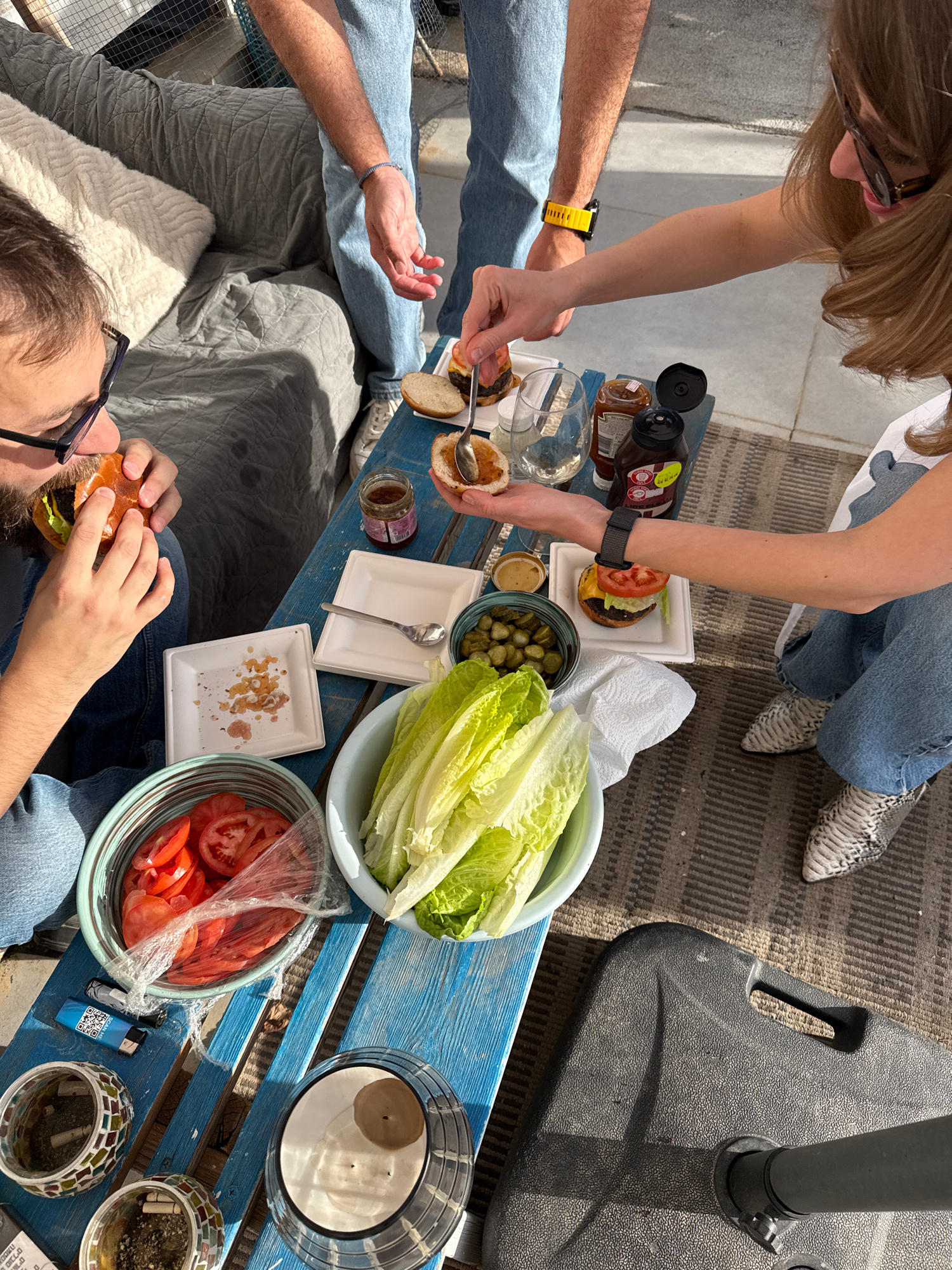 The image captures a casual outdoor meal scene, likely on a rooftop or balcony in Tel-Aviv, Israel, under direct sunlight. Three individuals are partially visible. In the left foreground, a male subje…read more