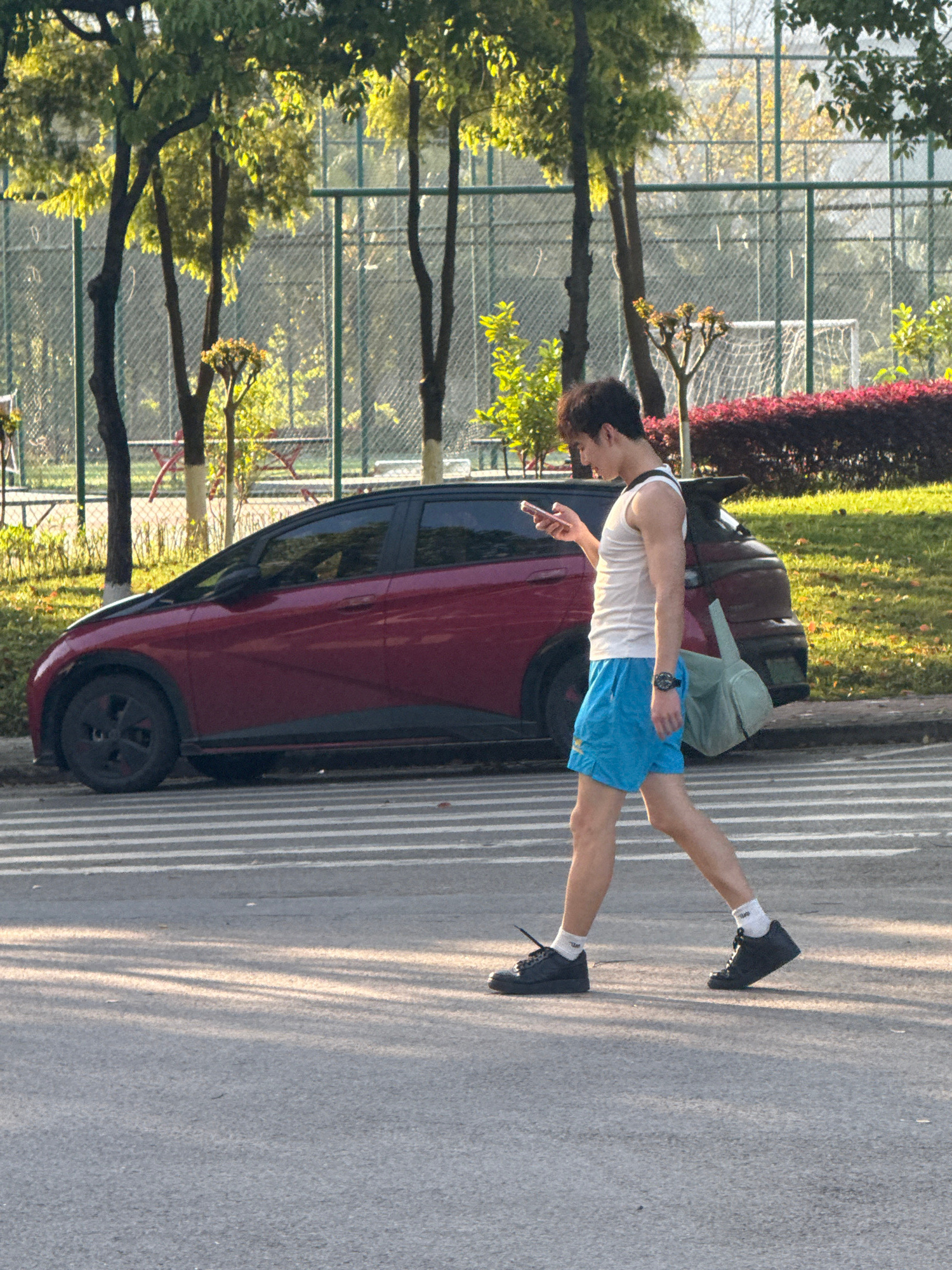 A horizontal, eye-level shot shows a person standing next to a red car. The person is wearing a white tank top, blue shorts, white socks, and black shoes. The person appears to be holding a cell phone…read more