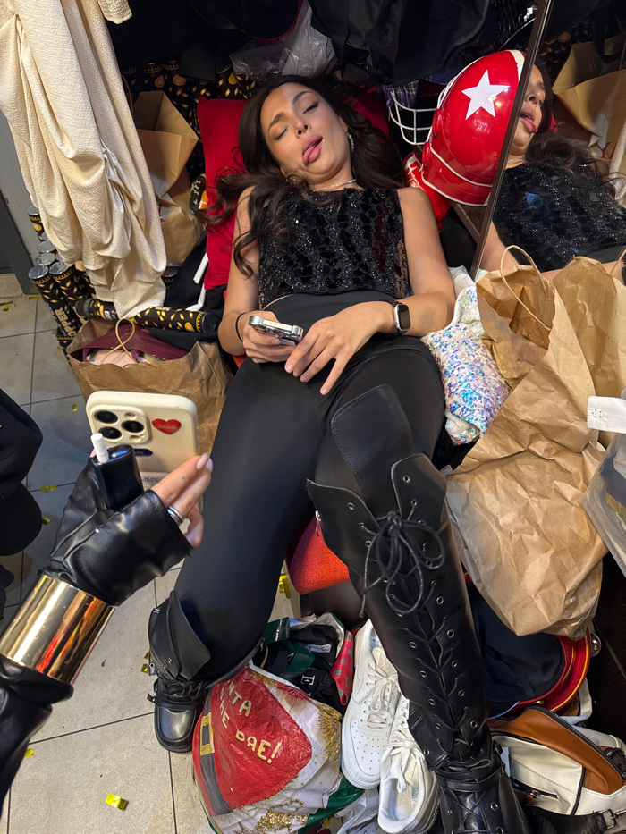 A woman in black leggings and lace-up boots lies amid bags, clothing, and accessories. She wears a sequined top and a watch. A red helmet with a white star sits nearby. Another woman, wearing a black…read more