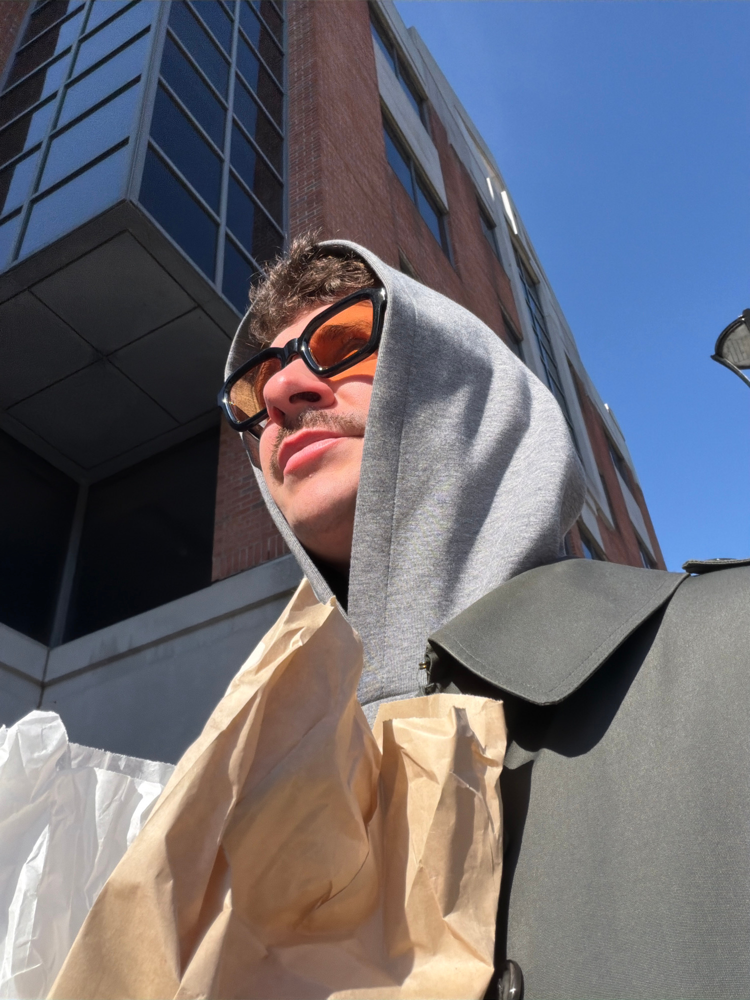 The image captures a male individual in an outdoor urban setting in Montreal, Canada, observed from the mid-chest upward. He wears a grey hooded sweatshirt with the hood pulled over his head, beneath…read more
