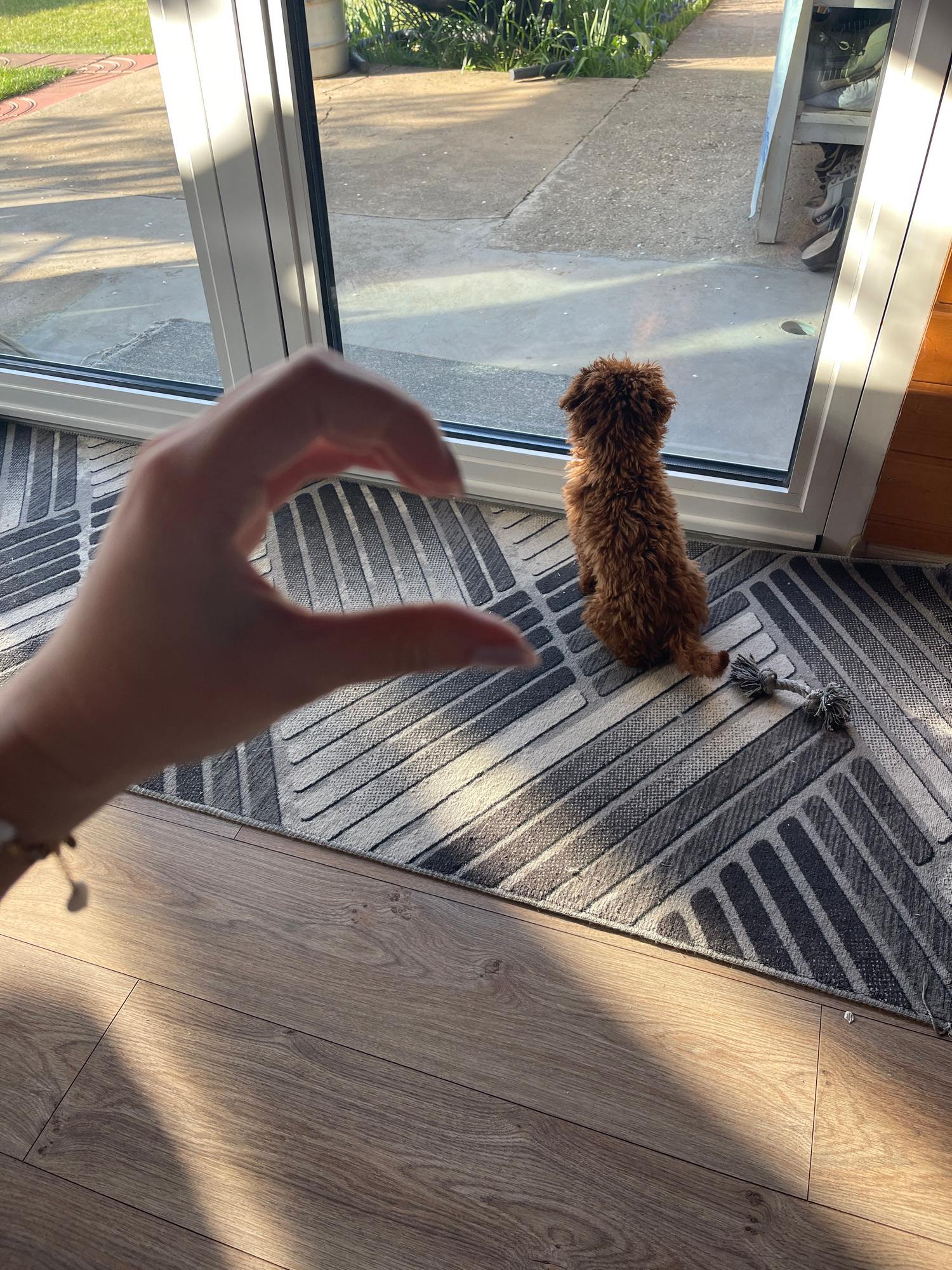 A high-angle indoor shot captures a small, fluffy brown dog, a person's hand, and interior flooring looking out through a glass door. The scene is illuminated by bright, directional sunlight, suggesti…read more