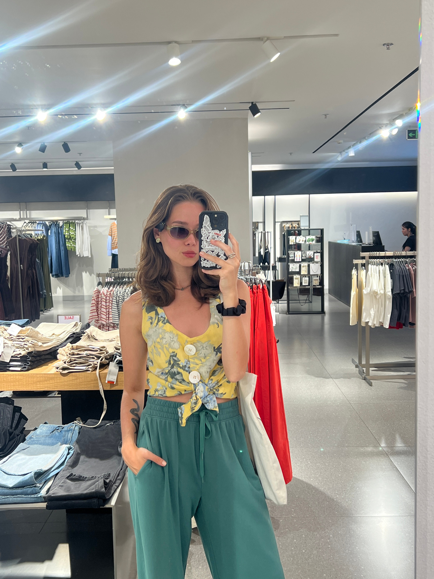 A person wearing sunglasses and holding a phone with a patterned case is taking a mirror selfie in a clothing store. The person is wearing a floral yellow top and green pants. The background shows rac…read more