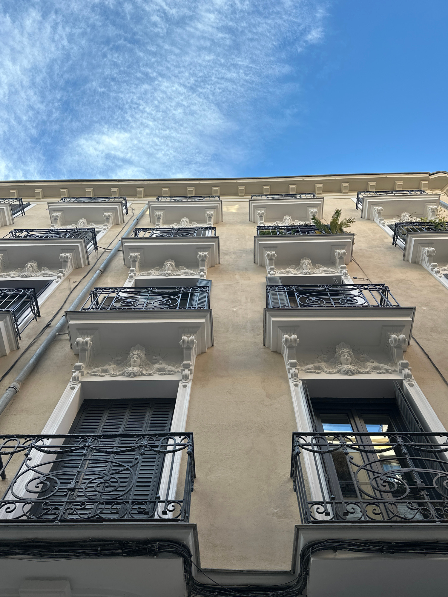 An upward-angled shot of an apartment building in Madrid, Spain, displays a pale yellow facade, rows of white-framed windows, and wrought-iron balconies. Architectural details include ornate carvings…read more
