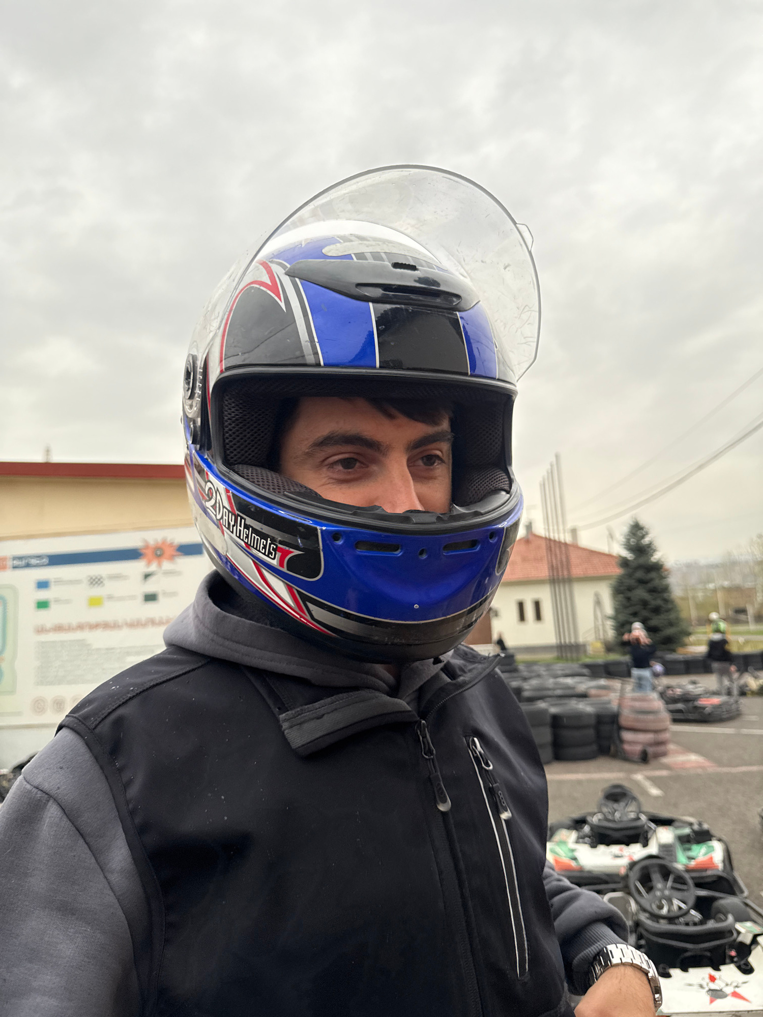 A person wearing a blue, black, and white helmet is standing outdoors, likely at a go-karting facility. Several go-karts are visible in the background, along with tires used for track boundaries. The…read more