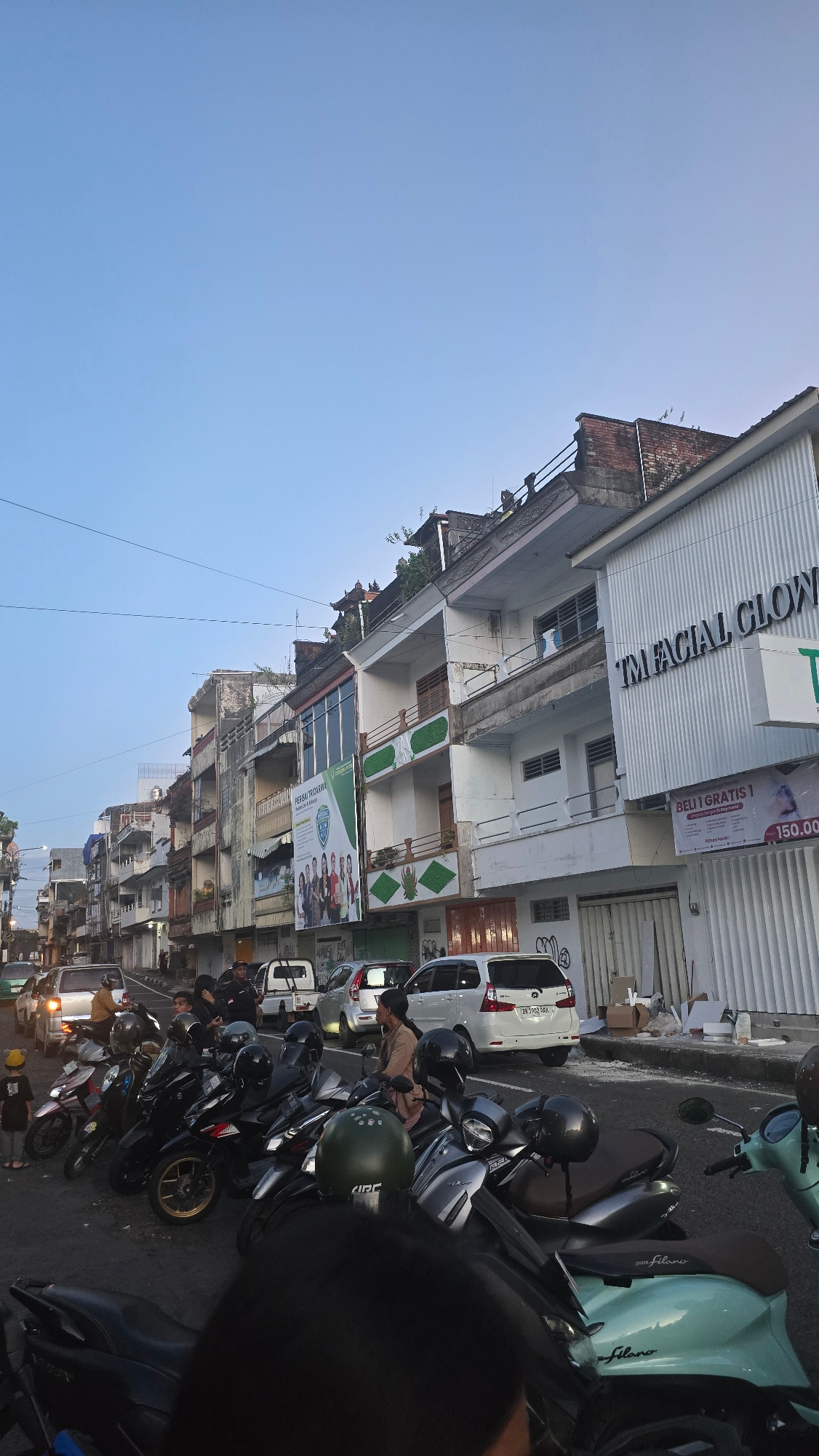 This image depicts a bustling street scene in what appears to be a town or city, under a clear blue sky, indicating daytime. The perspective is looking down a street lined with multi-story buildings o…read more