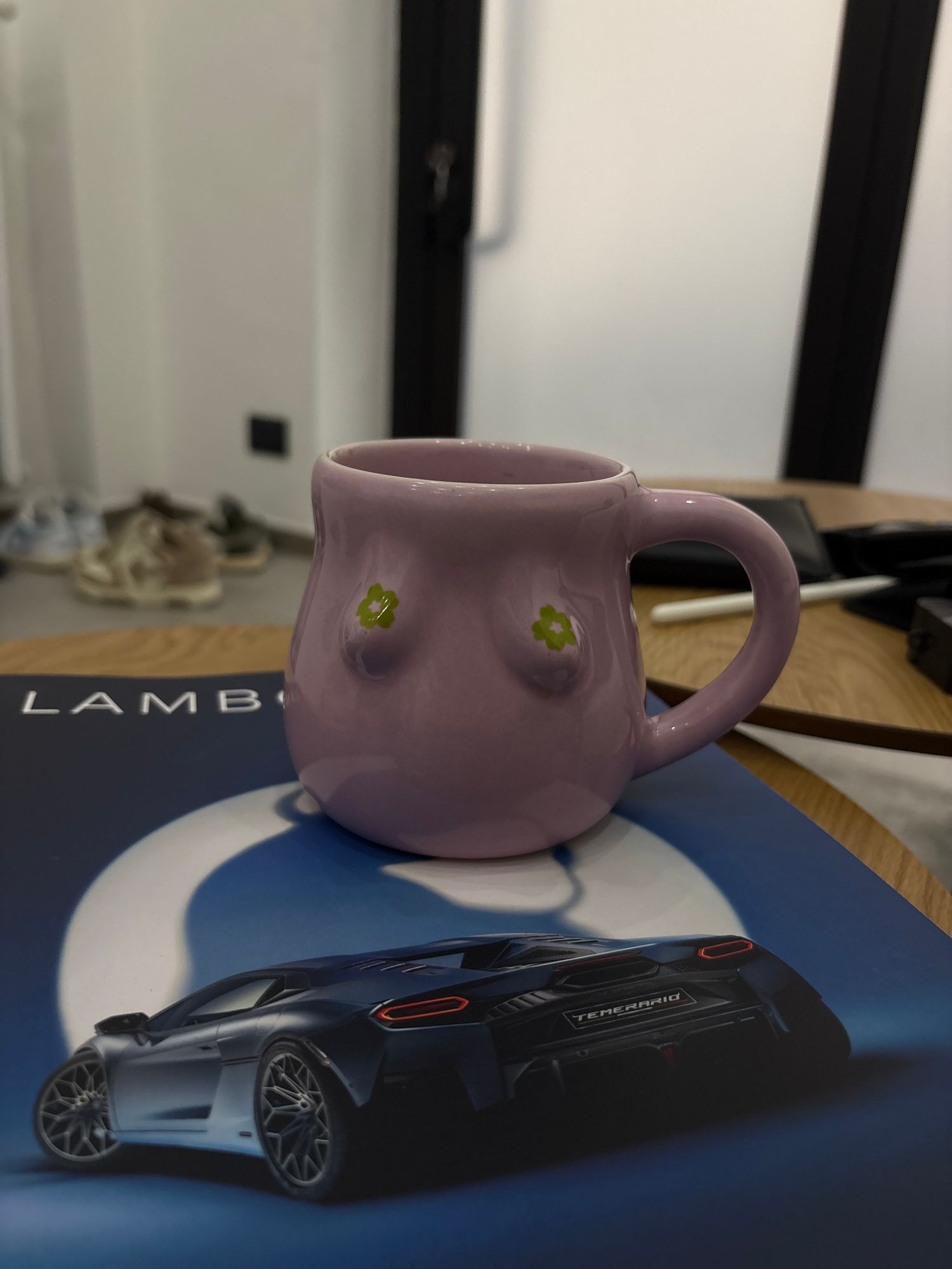 A lilac mug with a raised floral design is positioned on a book with the partial word "LAMBO" visible. The book also features a car, possibly a Lamborghini, with the word "TEMERARIO" on it. The scene…read more