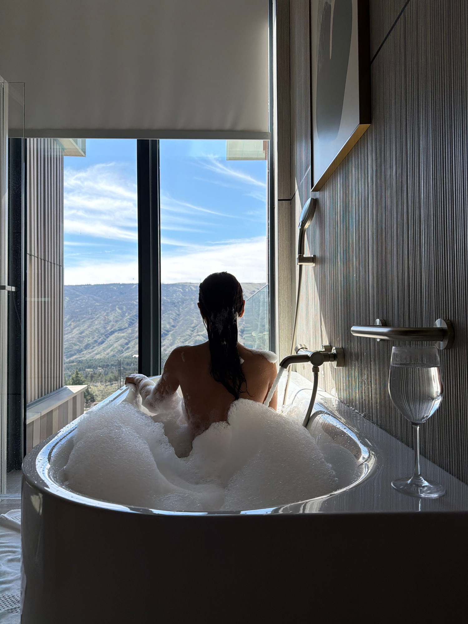 A person is in a bathtub filled with bubbles. There is a window behind the bathtub. The scene appears to be in a modern bathroom with gray tile. Outside the window is a landscape with mountains and a…read more