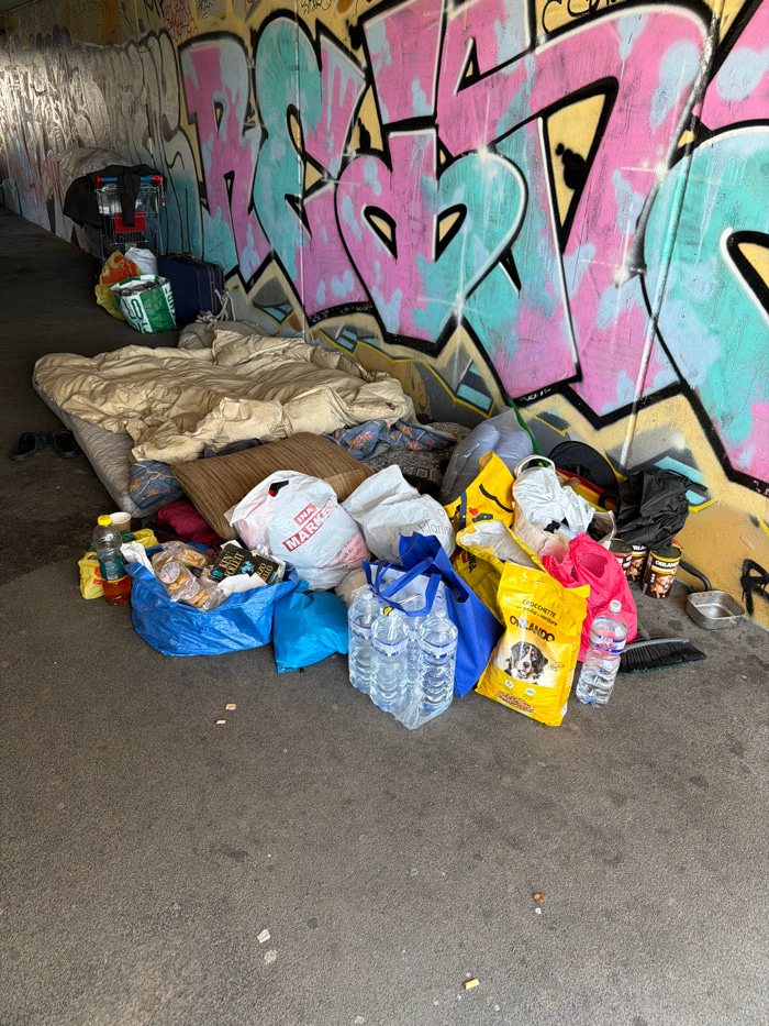 The scene depicts a makeshift encampment within an urban underpass or tunnel in Milan, Italy. The concrete wall on the right is extensively covered in vibrant graffiti, primarily featuring large lette…read more