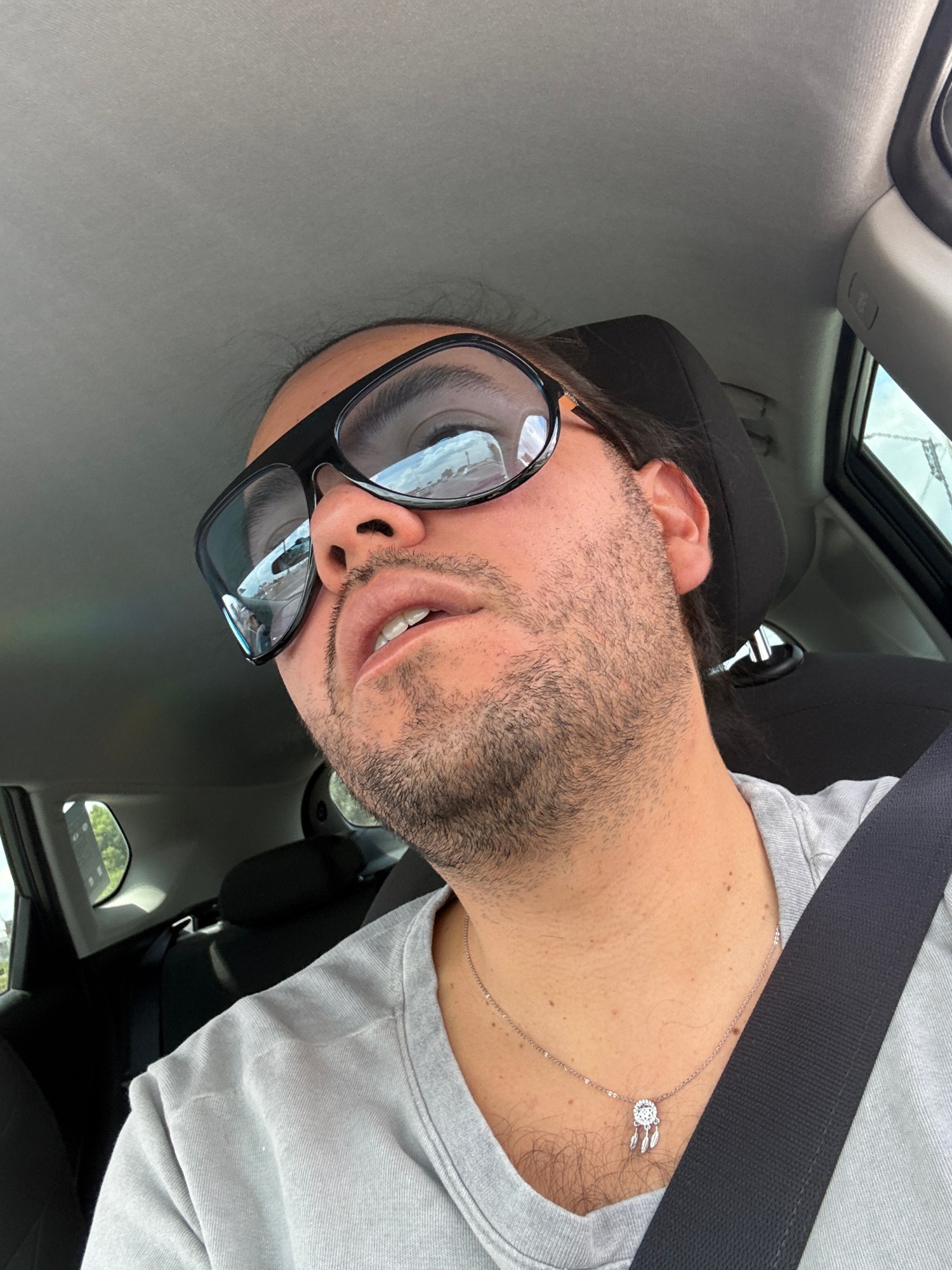 A selfie taken from a low angle inside a vehicle, potentially a car. The subject is a light-skinned male wearing a grey shirt and a black seatbelt. He has dark hair and a beard. He's wearing large bla…read more