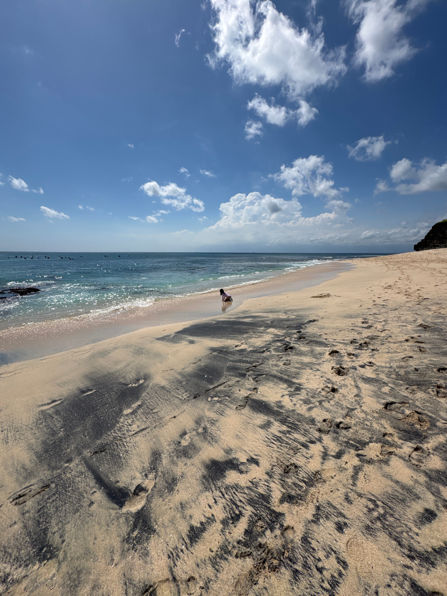 The image shows a beach with alternating bands of light and dark sand in Kuta Selatan, Indonesia. The water is clear and blue with small waves. A single person is visible at the water's edge. The sky…read more