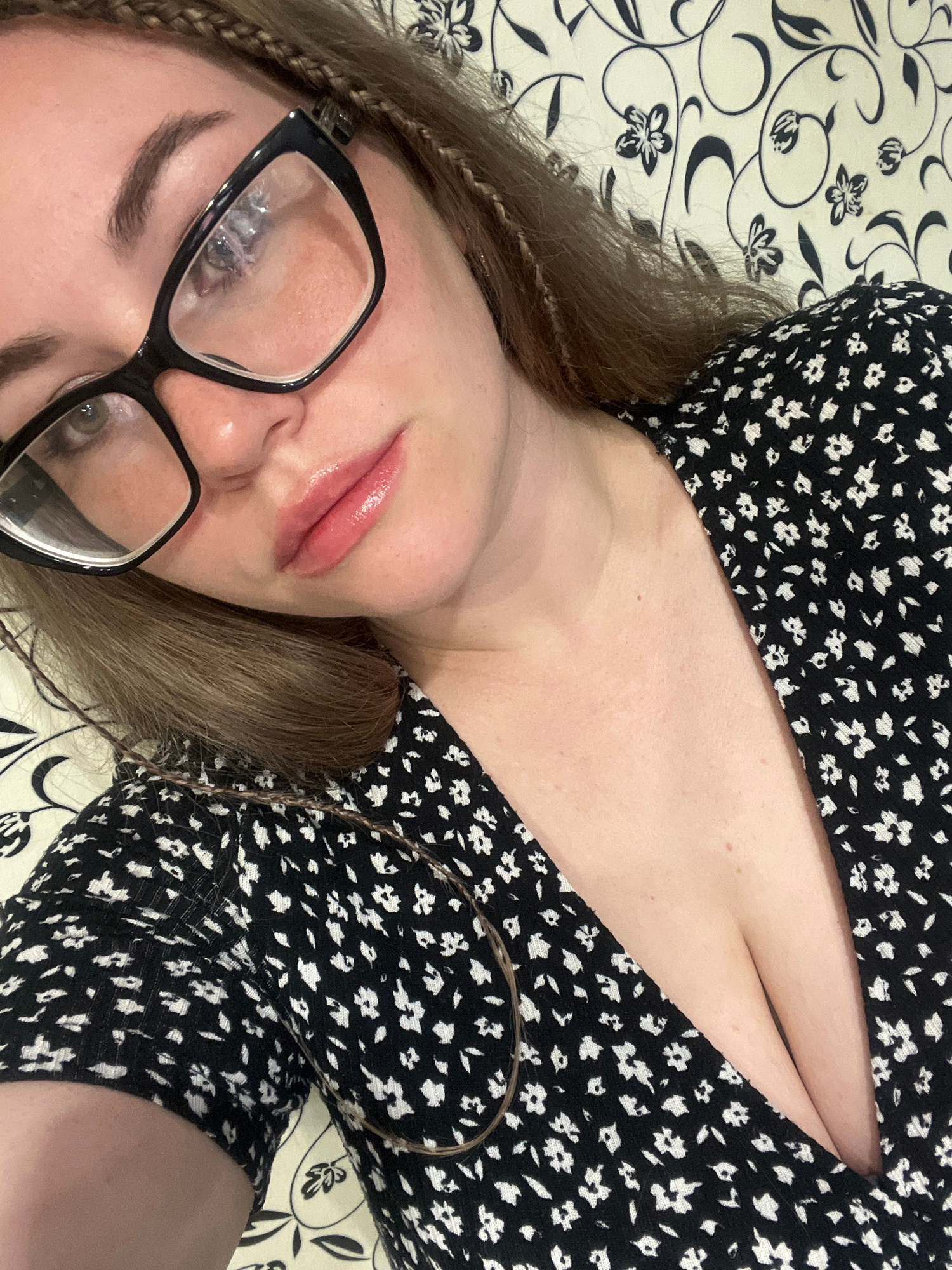 A woman with light skin and brown hair is lying down. She is wearing black-framed glasses and a black and white floral patterned dress. The background is a cream-colored fabric with a black floral pat…read more