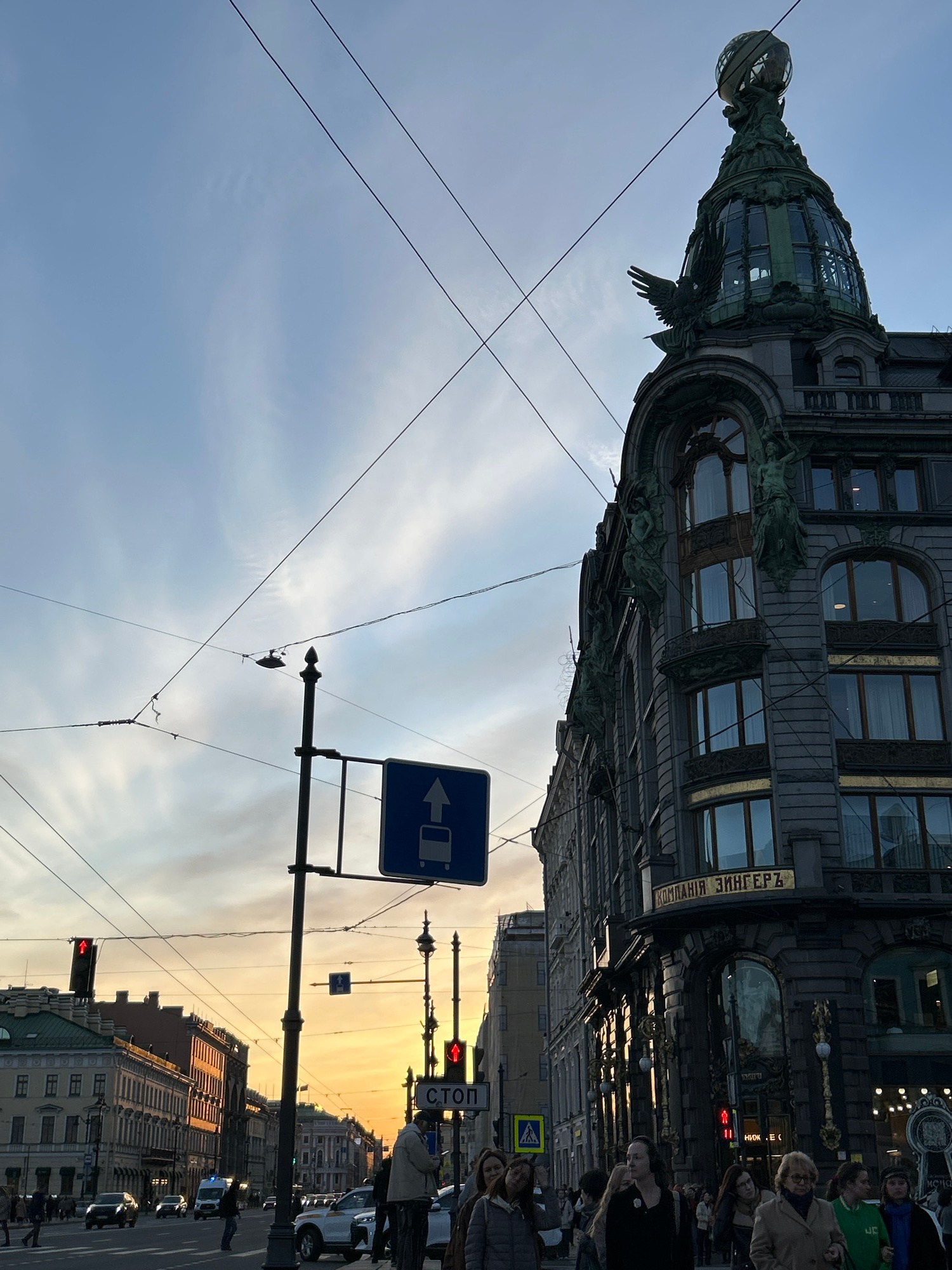 The image depicts an urban street scene in Saint Petersburg, Russia, captured during what appears to be sunset or late afternoon, given the warm, golden light illuminating the horizon. The most promi…read more