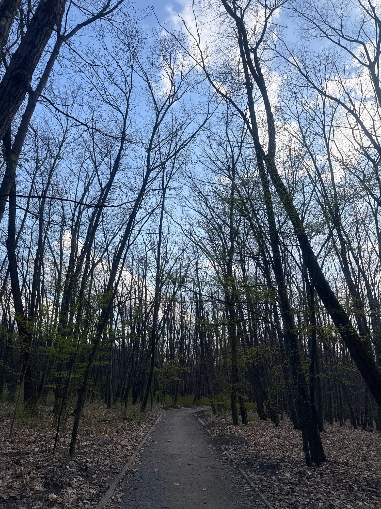 The image depicts a pathway through a forest or park in Sofia, Bulgaria. Tall, leafless trees line the path, their branches reaching toward a blue sky with scattered clouds. The path is flanked by gro…read more