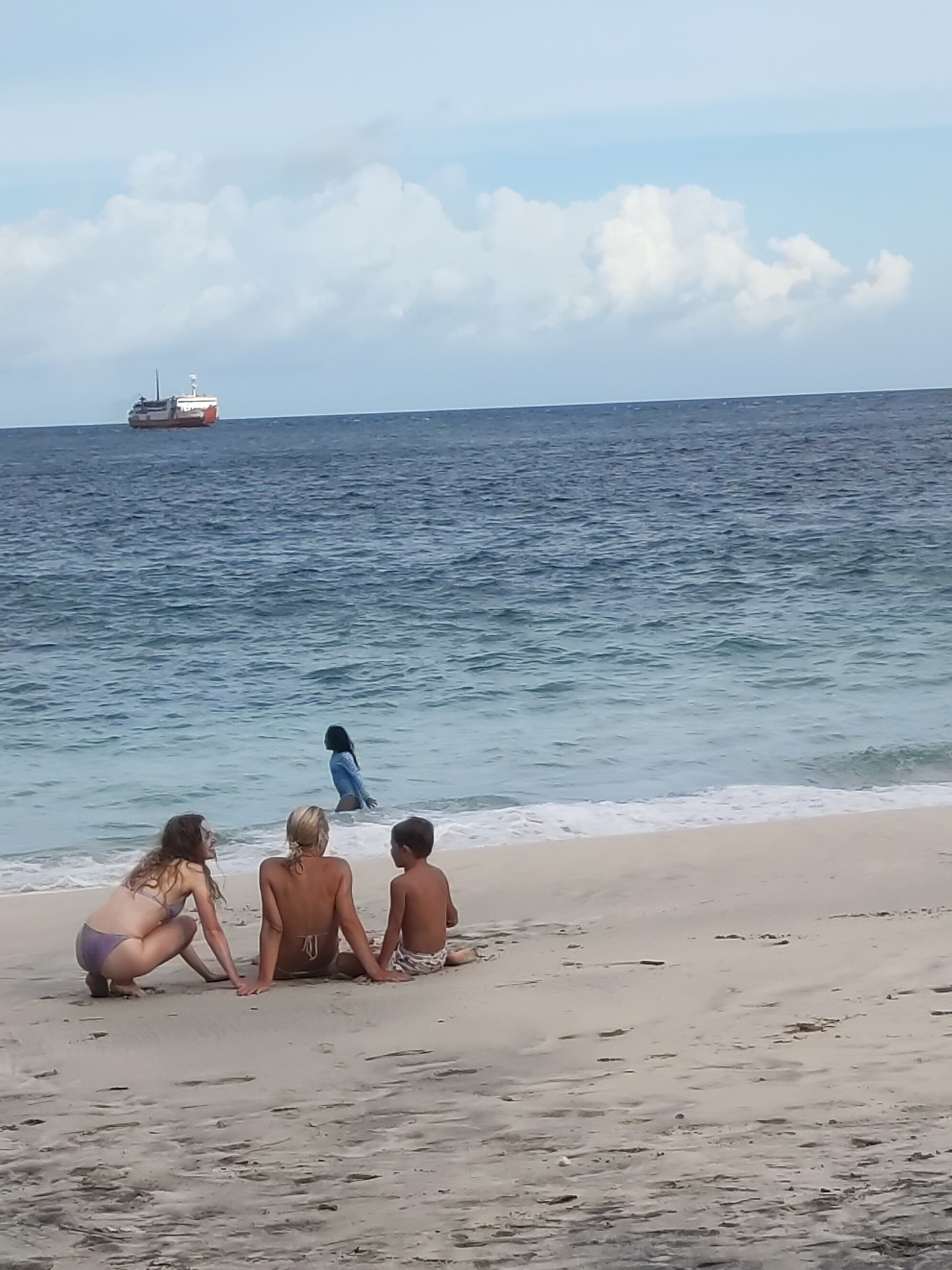 Padangbai, Indonesia: Two light-skinned women and a boy are seated on a sandy beach, facing the ocean. One woman is crouching while the other woman and boy are sitting. A person in blue swimwear is wading in the water. A large ship is visible in the distance. The sky is partly cloudy. | Open Wire