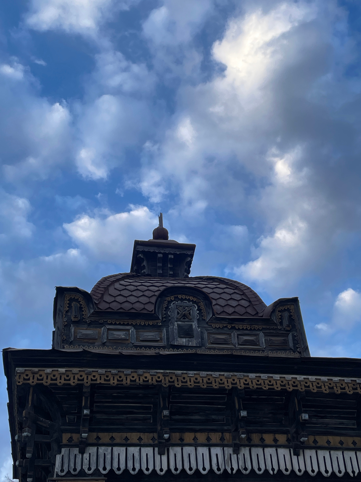 The image depicts the upper portion of the Cherepanovs' House, located at Kuybysheva Street, 40, in Yekaterinburg, Russia. The structure is an ornate wooden building, captured from a low angle against…read more