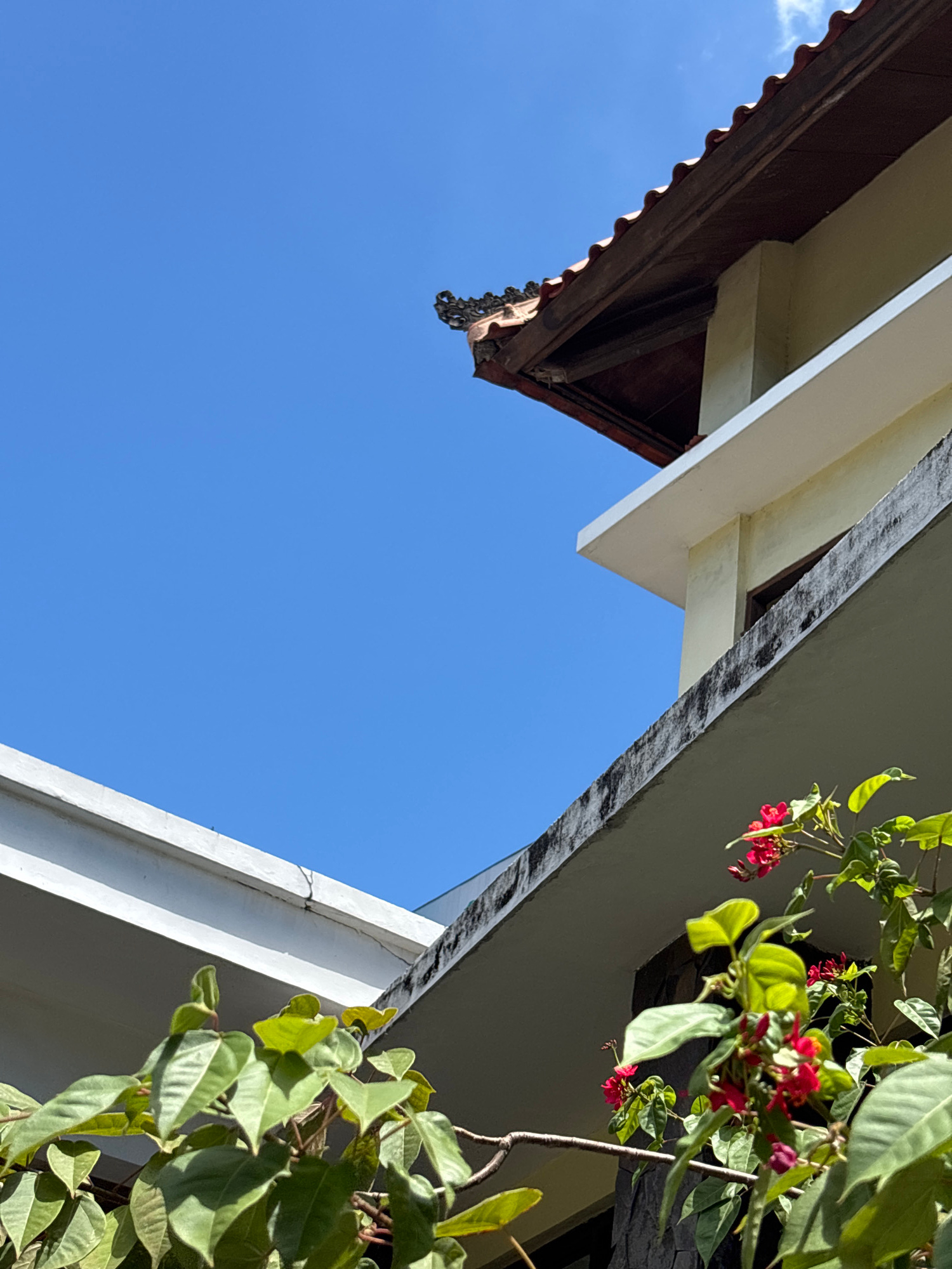 A low-angle shot shows a clear blue sky partially framed by architectural elements and vegetation. On the left, the edge of a brown tiled roof and a white architectural support structure are visible.…read more