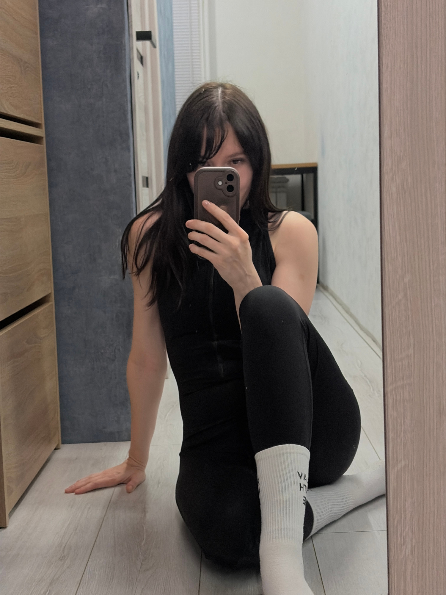 The image is a mirror selfie taken in an indoor setting, possibly an apartment or house, located in what appears to be the city of Chaikovsky, Russia, based on certain clues. The subject is a young wo…read more