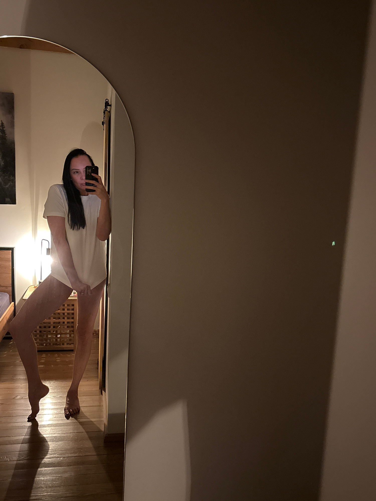 A woman is visible in a mirror, taking a selfie with a smartphone. She's wearing a white t-shirt and appears to be barefoot. The room behind her has wooden flooring, a wooden lattice panel, and a bed.…read more