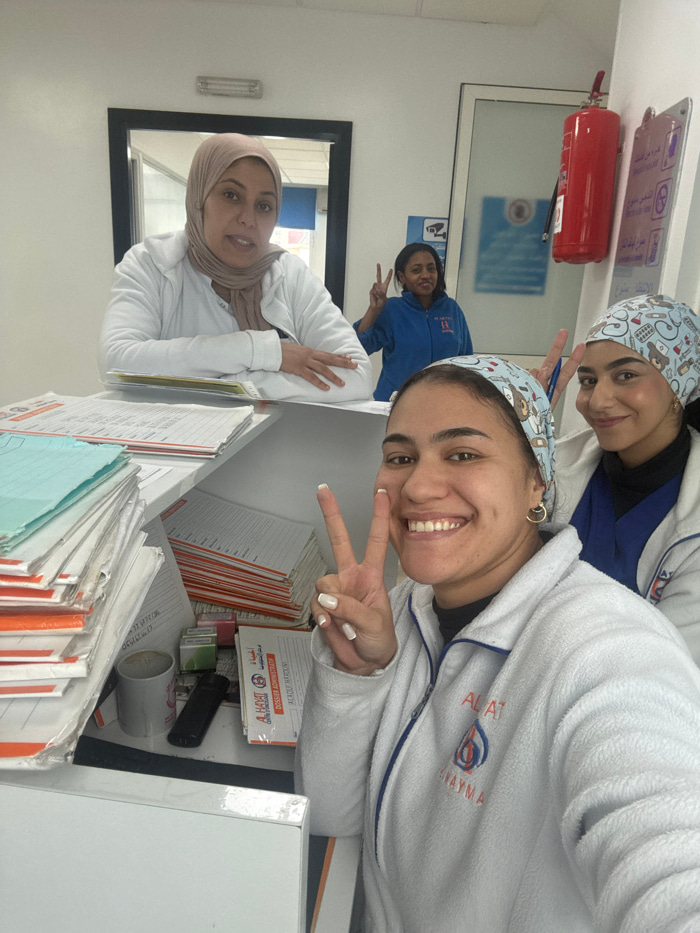Four adult females are depicted in a well-lit indoor reception or administrative office of a medical facility in Meknes, Morocco. In the foreground, two women pose smiling behind a white counter. The…read more